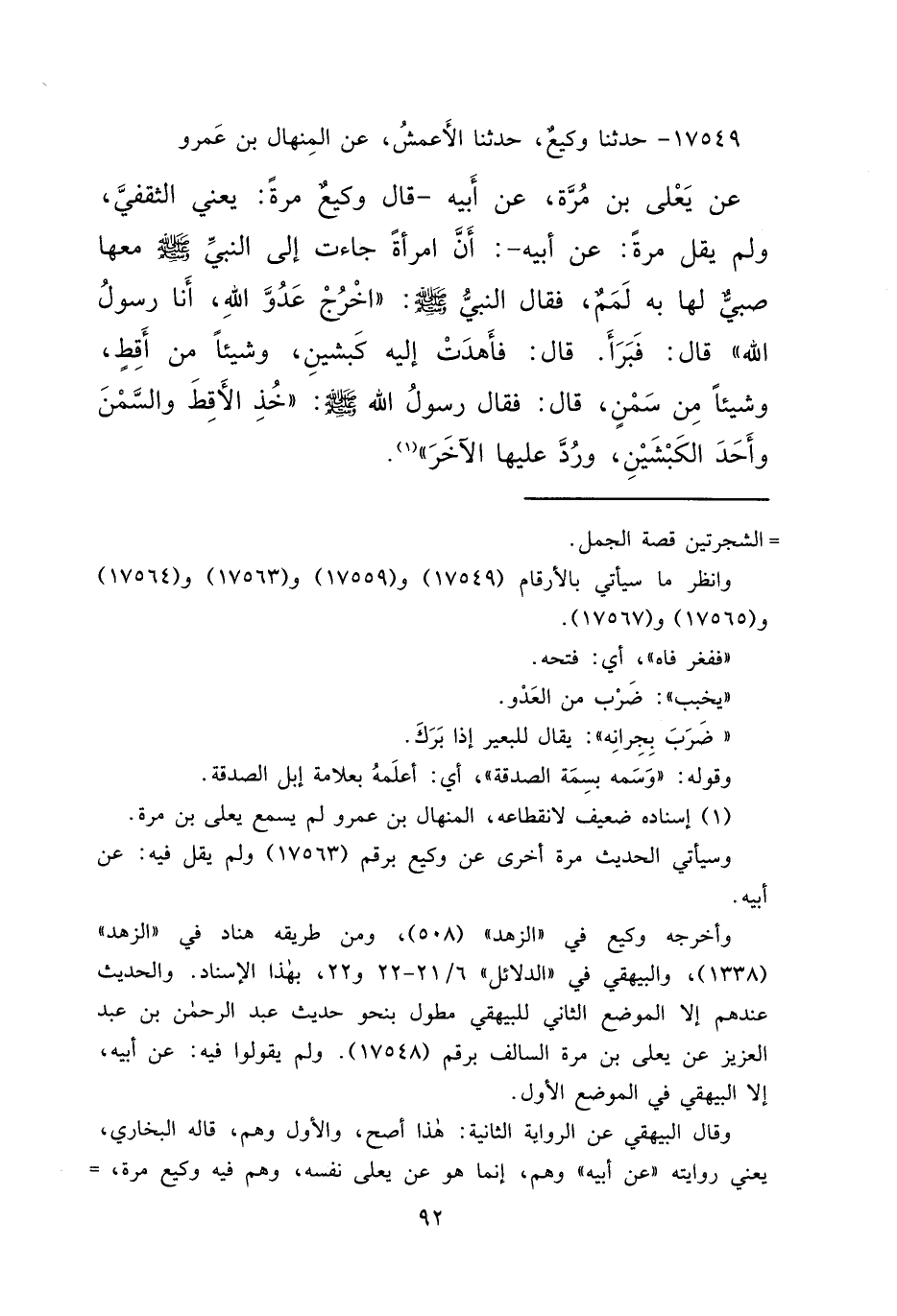 ١٧٥٤٩ - حَدَّثَنَا وَكِيعٌ، حَدَّثَنَا الْأَعْمَشُ، عَنْ الْمِنْهَالِ بْنِ عَمْرٍو، عَنْ يَعْلَى بْنِ مُرَّةَ، عَنْ أَبِيهِ - قَالَ وَكِيعٌ: مُرَّةَ يَعْنِي الثَّقَفِيَّ، وَلَمْ يَقُلْ: مُرَّةَ عَنْ أَبِيهِ -، أَنَّ امْرَأَةً جَاءَتْ إِلَى النَّبِيِّ صَلَّى اللهُ عَلَيْهِ وَسَلَّمَ مَعَهَا صَبِيٌّ لَهَا بِهِ لَمَمٌ، فَقَالَ النَّبِيُّ صَلَّى اللهُ عَلَيْهِ وَسَلَّمَ: " اخْرُجْ عَدُوَّ اللهِ، أَنَا رَسُولُ اللهِ " قَالَ: فَبَرَأَ. فَأَهْدَتْ إِلَيْهِ كَبْشَيْنِ، وَشَيْئًا مِنْ أَقِطٍ، وَشَيْئًا مِنْ سَمْنٍ، قَالَ: فَقَالَ رَسُولُ اللهِ صَلَّى اللهُ عَلَيْهِ وَسَلَّمَ: " خُذِ الْأَقِطَ وَالسَّمْنَ وَأَحَدَ الْكَبْشَيْنِ، وَرُدَّ عَلَيْهَا الْآخَرَ " (١)