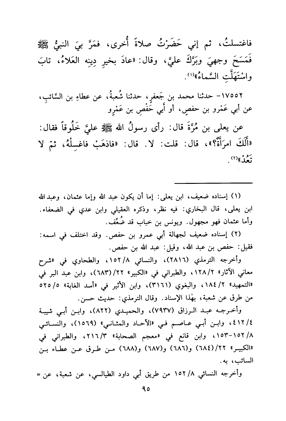 ١٧٥٥٢ - حَدَّثَنَا مُحَمَّدُ بْنُ جَعْفَرٍ، حَدَّثَنَا شُعْبَةُ، عَنْ عَطَاءِ بْنِ السَّائِبِ، عَنْ أَبِي عَمْرِو بْنِ حَفْصٍ، أَوْ أَبِي حَفْصِ بْنِ عَمْرٍو، عَنْ يَعْلَى بْنِ مُرَّةَ قَالَ: رَأَى رَسُولُ اللهِ صَلَّى اللهُ عَلَيْهِ وَسَلَّمَ عَلَيَّ خَلُوقًا فَقَالَ: " أَلَكَ امْرَأَةٌ؟ " قَالَ: قُلْتُ: لَا. قَالَ: " فَاذْهَبْ فَاغْسِلْهُ، ثُمَّ لَا تَعُدْ " (٢)