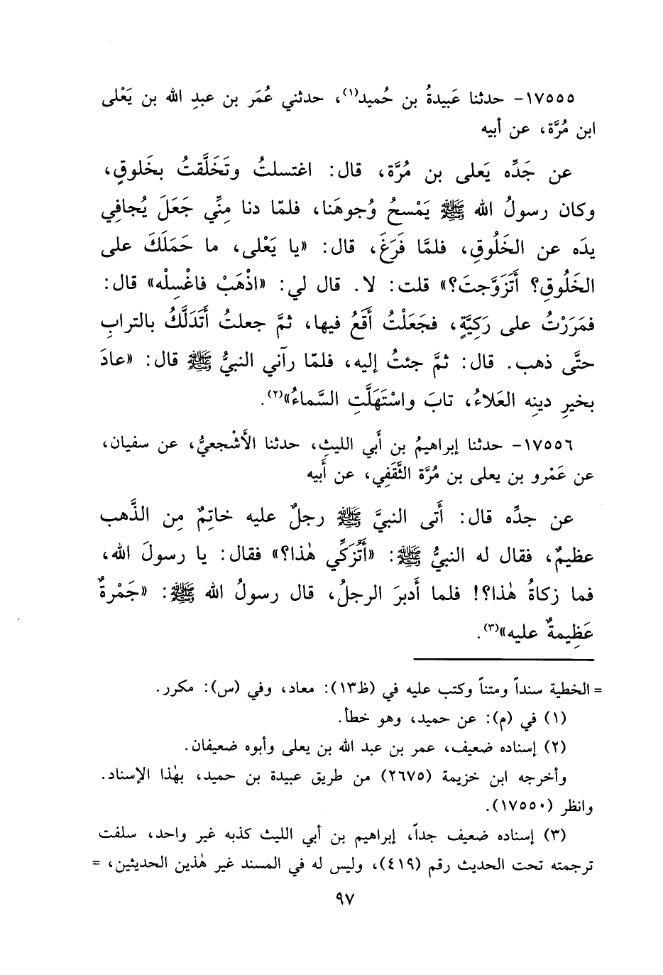 ١٧٥٥٥ - حَدَّثَنَا عَبِيدَةُ بْنُ حُمَيْدٍ (١) ، حَدَّثَنِي عُمَرُ بْنُ عَبْدِ اللهِ بْنِ يَعْلَى بْنِ مُرَّةَ، عَنْ أَبِيهِ، عَنْ جَدِّهِ يَعْلَى بْنِ مُرَّةَ، قَالَ: اغْتَسَلْتُ وَتَخَلَّقْتُ بِخَلُوقٍ، وَكَانَ رَسُولُ اللهِ صَلَّى اللهُ عَلَيْهِ وَسَلَّمَ يَمْسَحُ وُجُوهَنَا، فَلَمَّا دَنَا مِنِّي جَعَلَ يُجَافِي يَدَهُ عَنِ الْخَلُوقِ، فَلَمَّا فَرَغَ، قَالَ: " يَا يَعْلَى، مَا حَمَلَكَ عَلَى الْخَلُوقِ؟ أَتَزَوَّجْتَ؟ " قُلْتُ: لَا. قَالَ لِي: " اذْهَبْ فَاغْسِلْهُ " قَالَ: فَمَرَرْتُ عَلَى رَكِيَّةٍ، فَجَعَلْتُ أَقَعُ فِيهَا، ثُمَّ جَعَلْتُ أَتَدَلَّكُ بِالتُّرَابِ حَتَّى ذَهَبَ. قَالَ: ثُمَّ جِئْتُ إِلَيْهِ، فَلَمَّا رَآنِي النَّبِيُّ صَلَّى اللهُ عَلَيْهِ وَسَلَّمَ قَالَ: " عَادَ بِخَيْرِ دِينِهِ الْعَلَاءُ، تَابَ وَاسْتَهَلَّتِ السَّمَاءُ " (٢)