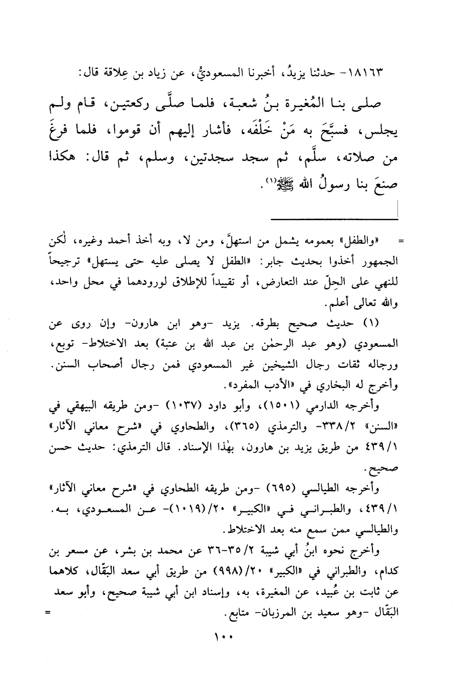 ١٨١٦٣ - حَدَّثَنَا يَزِيدُ، أَخْبَرَنَا الْمَسْعُودِيُّ، عَنْ زِيَادِ بْنِ عِلَاقَةَ، قَالَ: " صَلَّى بِنَا الْمُغِيرَةُ بْنُ شُعْبَةَ، فَلَمَّا صَلَّى رَكْعَتَيْنِ، قَامَ وَلَمْ يَجْلِسْ، فَسَبَّحَ بِهِ مَنْ خَلْفَهُ، فَأَشَارَ إِلَيْهِمْ أَنْ قُومُوا، فَلَمَّا فَرَغَ مِنْ صَلَاتِهِ سَلَّمَ، ثُمَّ سَجَدَ سَجْدَتَيْنِ "، ثُمَّ قَالَ: " هَكَذَا صَنَعَ بِنَا رَسُولُ اللهِ صَلَّى اللهُ عَلَيْهِ وَسَلَّمَ " (١)