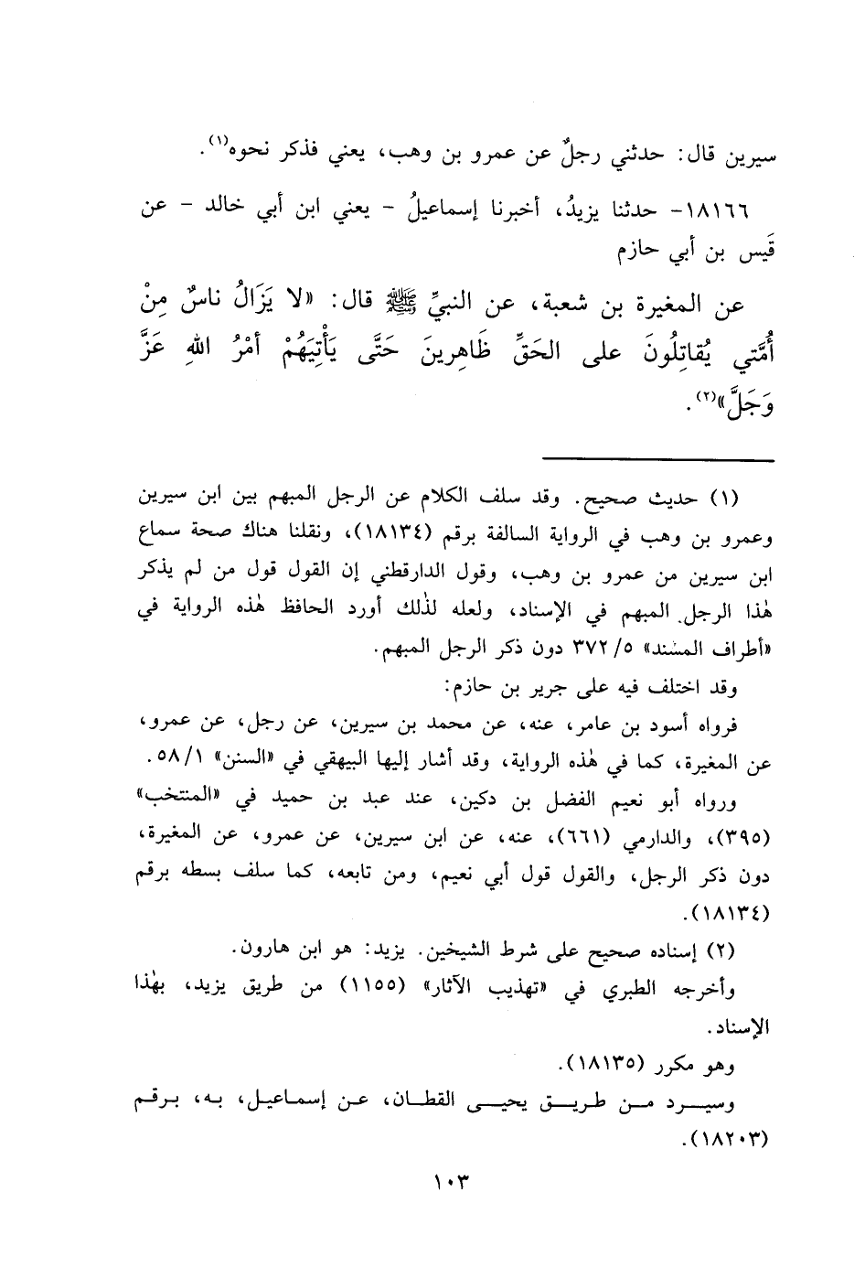 ١٨١٦٦ - حَدَّثَنَا يَزِيدُ، أَخْبَرَنَا إِسْمَاعِيلُ يَعْنِي ابْنَ أَبِي خَالِدٍ، عَنْ قَيْسِ بْنِ أَبِي حَازِمٍ، عَنِ الْمُغِيرَةِ بْنِ شُعْبَةَ، عَنِ النَّبِيِّ صَلَّى اللهُ عَلَيْهِ وَسَلَّمَ قَالَ: " لَا يَزَالُ نَاسٌ مِنْ أُمَّتِي يُقَاتِلُونَ عَلَى الْحَقِّ ظَاهِرِينَ حَتَّى يَأْتِيَهُمْ أَمْرُ اللهِ عَزَّ وَجَلَّ " (٢)