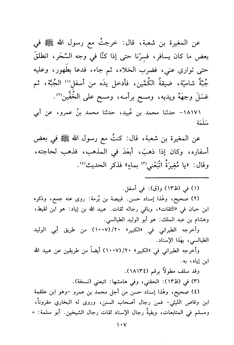١٨١٧١ - حَدَّثَنَا مُحَمَّدُ بْنُ عَبَيْدٍ، حَدَّثَنَا مُحَمَّدُ بْنُ عَمْرٍو، عَنِ أَبِي سَلَمَةَ، عَنِ الْمُغِيرَةِ بْنِ شُعْبَةَ قَالَ كُنْتُ مَعَ رَسُولِ اللهِ صَلَّى اللهُ عَلَيْهِ وَسَلَّمَ فِي بَعْضِ أَسْفَارِهِ، وَكَانَ إِذَا ذَهَبَ أَبْعَدَ فِي الْمَذْهَبِ، فَذَهَبَ لِحَاجَتِهِ وَقَالَ: " يَا مُغِيرَةُ اتْبَعْنِي (٣) بِمَاءٍ " فَذَكَرَ الْحَدِيثَ (٤)