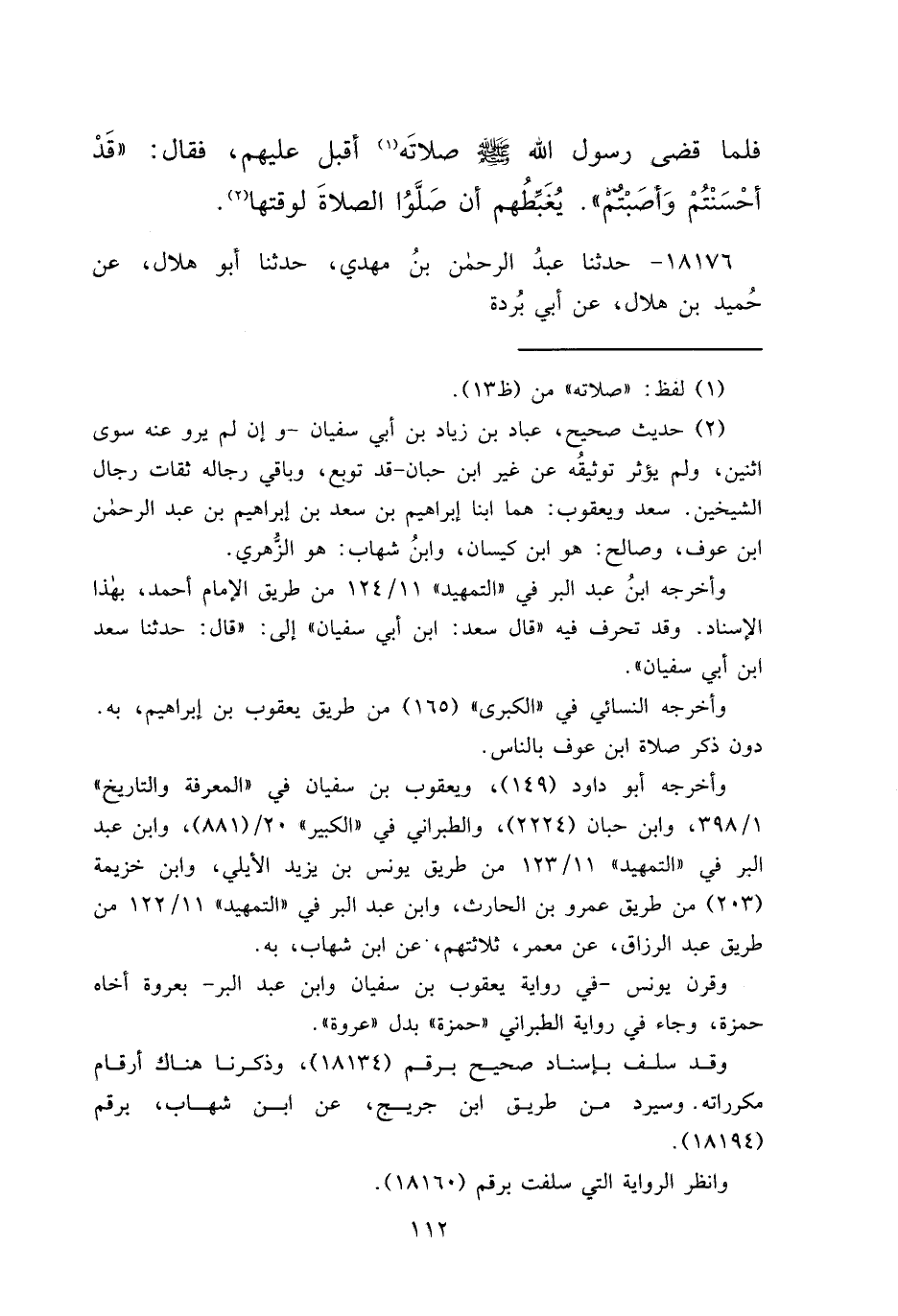 (٢) حديث صحيح، عباد بن زياد بن أبي سفيان - وإن لم يرو عنه سوى اثنين، ولم يؤثر توثيقه عن غير ابن حبان - قد توبع، وباقي رجاله ثقات رجال الشيخين. سعد ويعقوب: هما ابنا إبراهيم بن سعد بن إبراهيم بن عبد الرحمن ابن عوف، وصالح: هو ابن كيسان، وابنُ شهاب: هو الزهري.