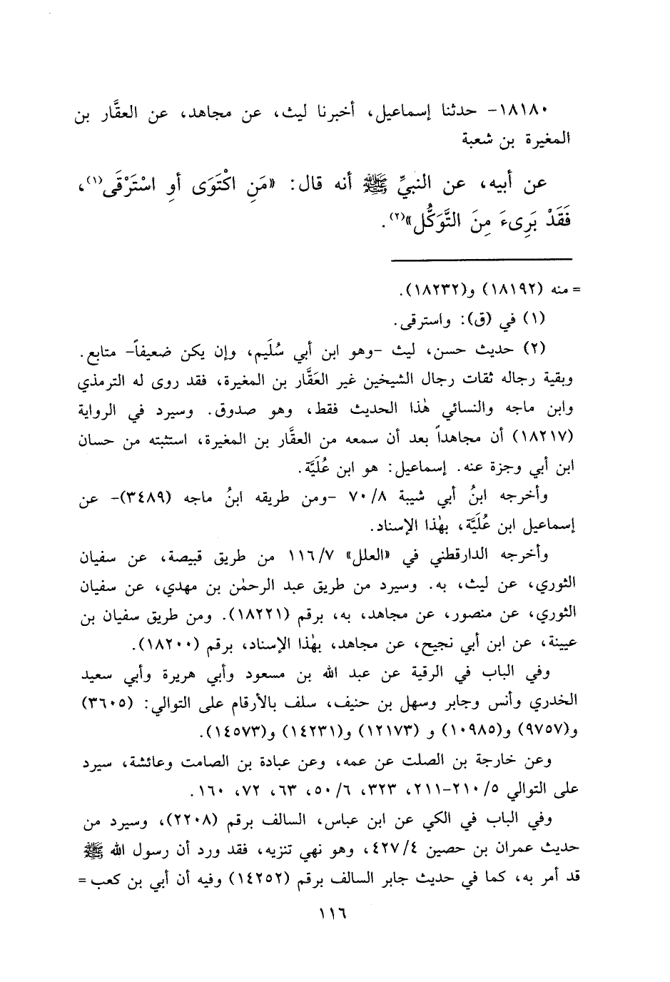 ١٨١٨٠ - حَدَّثَنَا إِسْمَاعِيلُ، أَخْبَرَنَا لَيْثٌ، عَنْ مُجَاهِدٍ، عَنِ الْعَقَّارِ بْنِ الْمُغِيرَةِ بْنِ شُعْبَةَ، عَنْ أَبِيهِ، عَنِ النَّبِيِّ صَلَّى اللهُ عَلَيْهِ وَسَلَّمَ أَنَّهُ قَالَ: " مَنِ اكْتَوَى، أَوْ اسْتَرْقَى (١) ، فَقَدْ بَرِئَ مِنَ التَّوَكُّلِ " (٢)
