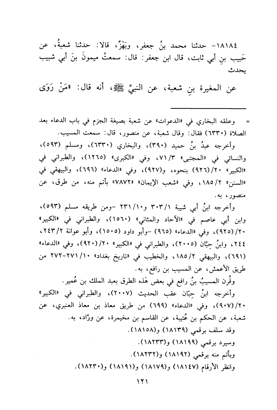 ١٨١٨٤ - حَدَّثَنَا مُحَمَّدُ بْنُ جَعْفَرٍ، وَبَهْزٌ، قَالَا: حَدَّثَنَا شُعْبَةُ، عَنْ حَبِيبِ بْنِ أَبِي ثَابِتٍ، قَالَ ابْنُ جَعْفَرٍ: قَالَ: سَمِعْتُ مَيْمُونَ بْنَ أَبِي شَبِيبٍ، يُحَدِّثُ عَنِ الْمُغِيرَةِ بْنِ شُعْبَةَ، عَنِ النَّبِيِّ صَلَّى اللهُ عَلَيْهِ وَسَلَّمَ، أَنَّهُ قَالَ: " مَنْ رَوَى