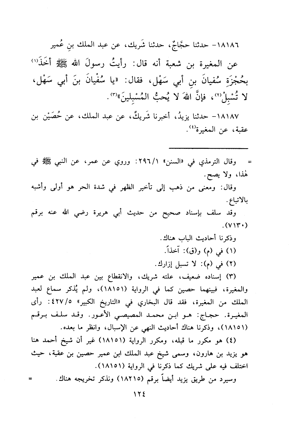 (٣) إسناده ضعيف، علته شريك، والانقطاع بين عبد الملك بن عمير والمغيرة، فبينهما حصين كما في الرواية (١٨١٥١) ، ولم يُذكر سماع لعبد الملك من المغيرة، فقد قال البخاري في "التاريخ الكبير" ٥/٤٢٧: رأى المغيرة حجاج: هو ابن محمد المصيصي الأعور. وقد سلف برقم (١٨١٥١) ، وذكرنا هناك أحاديث النهي عن الإسبال، وانظر ما بعده.