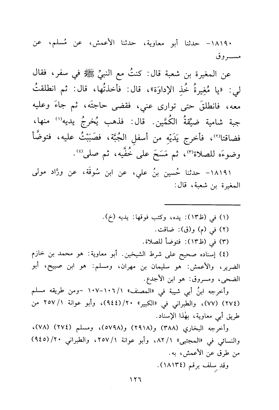 ١٨١٩٠ - حَدَّثَنَا أَبُو مُعَاوِيَةَ، حَدَّثَنَا الْأَعْمَشُ، عَنْ مُسْلِمٍ، عَنْ مَسْرُوقٍ، عَنِ الْمُغِيرَةِ بْنِ شُعْبَةَ، قَالَ: كُنْتُ مَعَ النَّبِيِّ صَلَّى اللهُ عَلَيْهِ وَسَلَّمَ فِي سَفَرٍ، فَقَالَ لِي: " يَا مُغِيرَةُ، خُذِ الْإِدَاوَةَ " قَالَ: فَأَخَذْتُهَا، قَالَ: ثُمَّ انْطَلَقْتُ مَعَهُ، فَانْطَلَقَ حَتَّى تَوَارَى عَنِّي، فَقَضَى حَاجَتَهُ، ثُمَّ جَاءَ وَعَلَيْهِ جُبَّةٌ شَامِيَّةٌ ضَيِّقَةُ الْكُمَّيْنِ، قَالَ: فَذَهَبَ يُخْرِجُ يَدَيْهِ (١) مِنْهَا، فَضَاقَتَا (٢) ، فَأَخْرَجَ يَدَيْهِ مِنْ أَسْفَلِ الْجُبَّةِ، فَصَبَبْتُ عَلَيْهِ، فَتَوَضَّأَ وُضُوءَهُ لِلصَّلَاةِ (٣) ، ثُمَّ مَسَحَ عَلَى خُفَّيْهِ، ثُمَّ صَلَّى (٤)