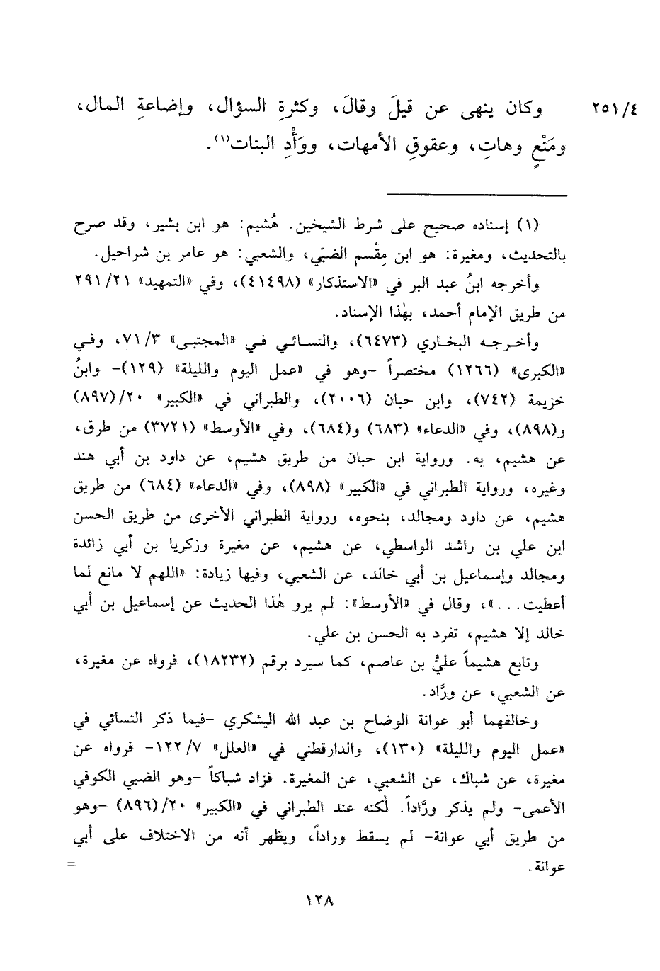وَكَانَ " يَنْهَى عَنْ قِيلَ وَقَالَ، وَكَثْرَةِ السُّؤَالِ، وَإِضَاعَةِ الْمَالِ، وَمَنْعٍ وَهَاتِ، وَعُقُوقِ الْأُمَّهَاتِ، وَوَأْدِ الْبَنَاتِ " (١)