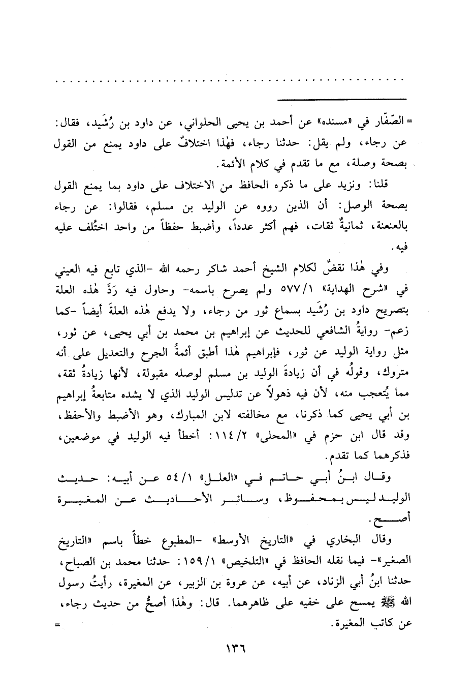 وفي هذا نقض لكلام الشيخ أحمد شاكر رحمه الله- الذي تابع فيه العيني في "شرح الهداية" ١/٥٧٧ ولم يصرح باسمه- وحاول فيه رَدَّ هذه العلة بتصريح داود بن رُشَيد بسماع ثور من رجاء، ولا يدفع هذه العلةَ أيضاً- كما زعم- روايةُ الشافعي للحديث عن إبراهيم بن محمد بن أبي يحيي، عن ثور، مثل رواية الوليد عن ثور، فإبراهيم هذا أطبق أئمة الجرح والتعديل على أنه متروك، وقولُه في أن زيادةَ الوليد بن مسلم لوصله مقبولة، لأنها زيادةُ ثقة، مما يُتعجب منه، لأن فيه ذهولاً عن تدليس الوليد الذي لا يشده متابعةُ إبراهيم بن أبي يحيى كما ذكرنا، مع مخالفته لابن المبارك، وهو الأضبط والأحفظ، وقد قال ابن حزم في "المحلى" ٢/١١٤: أخطأ فيه الوليد في موضعين، فذكرهما كما تقّدم.