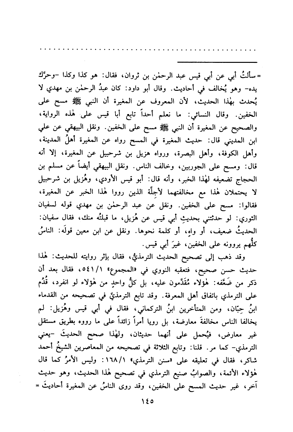 فقالوا: مسح على الخفين. ونقل عن عبد الرحمن بن مهدي قوله لسفيان الثوري: لو حدثتني بحديثِ أبي قيس عن هُزيل، ما قبلتُه منك، فقال سفيان: الحديثُ ضعيف، أو واهِ، أو كلمة نحوها. ونقل عن ابن معين قولَه: الناسُ كلهم يروونه على الخفين، غيرَ أبي قبس.