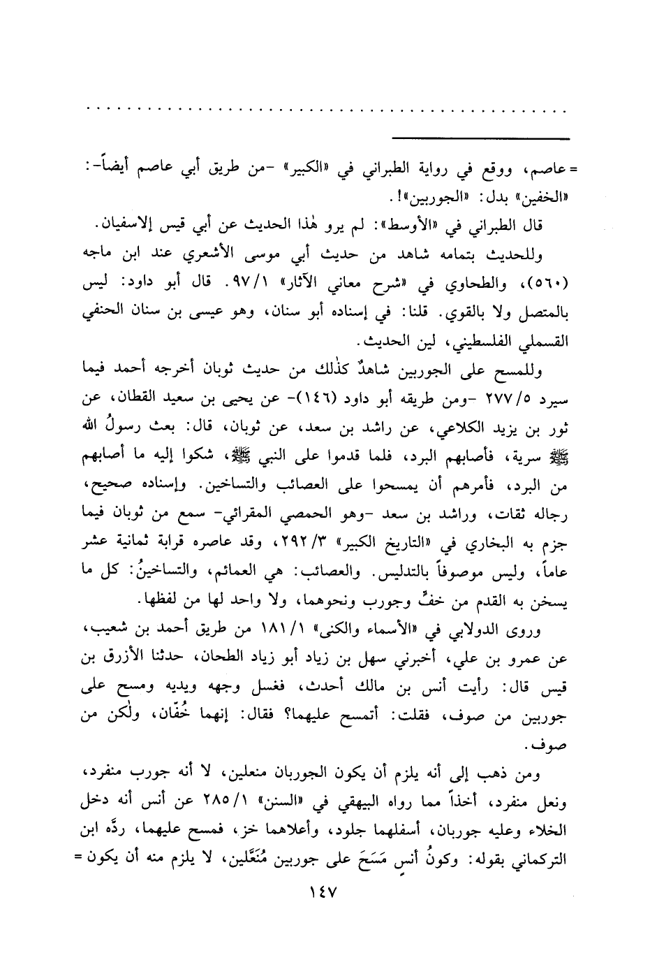 ومن ذهب إلى أنه يلزم أن يكون الجوربان منعلين، لا أنه جورب منفرد، ونعل منفرد، أخذا مما رواه البيهقي في "السنن" ١/٢٨٥ عن أنس أنه دخل الخلاء وعليه جوربان، أسفلهما جلود، وأعلاهما خز، فمسح عليهما، رده ابن التركماني بقوله: وكونُ أنس مَسَحَ على جوربين مُنَعَّلين، لا يلزم منه أن يكون=