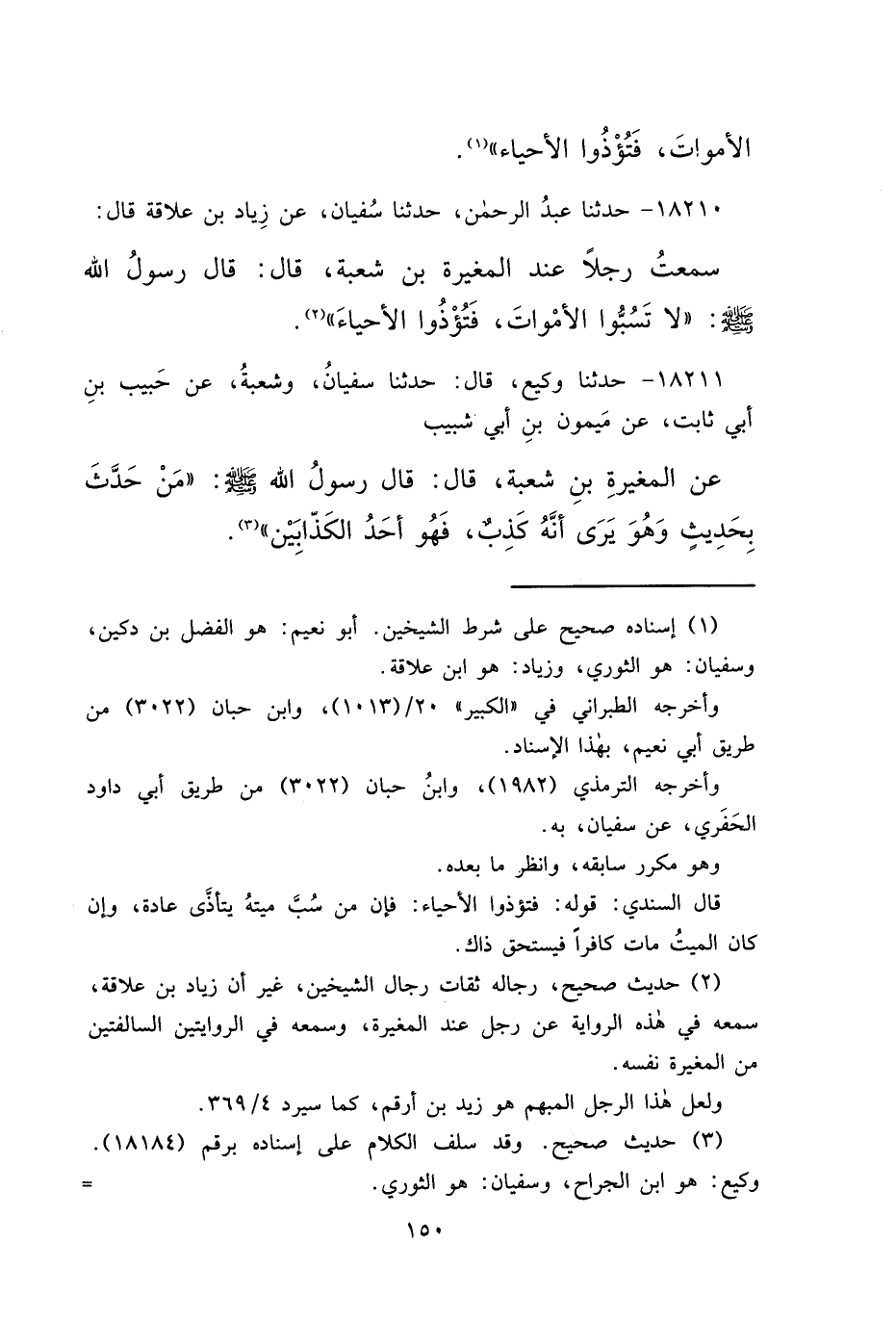 ١٨٢١٠ - حَدَّثَنَا عَبْدُ الرَّحْمَنِ، حَدَّثَنَا سُفْيَانُ، عَنْ زِيَادِ بْنِ عِلَاقَةَ، قَالَ: سَمِعْتُ رَجُلًا، عِنْدَ الْمُغِيرَةِ بْنِ شُعْبَةَ قَالَ: قَالَ رَسُولُ اللهِ صَلَّى اللهُ عَلَيْهِ وَسَلَّمَ: " لَا تَسُبُّوا الْأَمْوَاتَ، فَتُؤْذُوا الْأَحْيَاءَ " (٢)