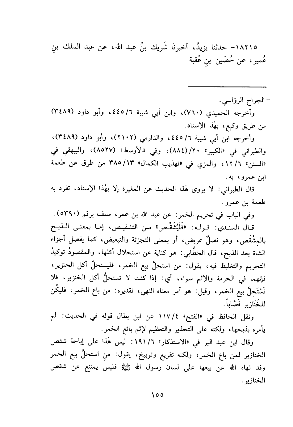 ١٨٢١٥ - حَدَّثَنَا يَزِيدُ، أَخْبَرَنَا شَرِيكُ بْنُ عَبْدِ اللهِ، عَنْ عَبْدِ الْمَلِكِ بْنِ عُمَيْرٍ، عَنْ حُصَيْنِ بْنِ عُقْبَةَ،