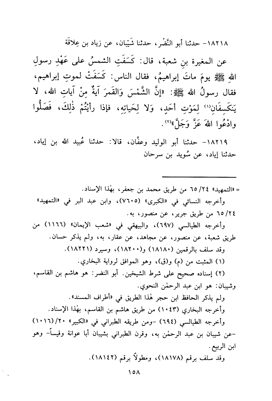 ١٨٢١٨ - حَدَّثَنَا أَبُو النَّضْرِ، حَدَّثَنَا شَيْبَانُ، عَنْ زِيَادِ بْنِ عِلَاقَةَ، عَنِ الْمُغِيرَةِ بْنِ شُعْبَةَ، قَالَ: كَسَفَتِ الشَّمْسُ عَلَى عَهْدِ رَسُولِ اللهِ صَلَّى اللهُ عَلَيْهِ وَسَلَّمَ يَوْمَ مَاتَ إِبْرَاهِيمُ، فَقَالَ النَّاسُ: كَسَفَتْ لِمَوْتِ إِبْرَاهِيمَ، فَقَالَ رَسُولُ اللهِ صَلَّى اللهُ عَلَيْهِ وَسَلَّمَ: " إِنَّ الشَّمْسَ وَالْقَمَرَ آيَةٌ مِنْ آيَاتِ اللهِ لَا يَنْكَسِفَانِ (١) لِمَوْتِ أَحَدٍ، وَلَا لِحَيَاتِهِ، فَإِذَا رَأَيْتُمْ ذَلِكَ، فَصَلُّوا وَادْعُوا اللهَ عَزَّ وَجَلَّ " (٢)