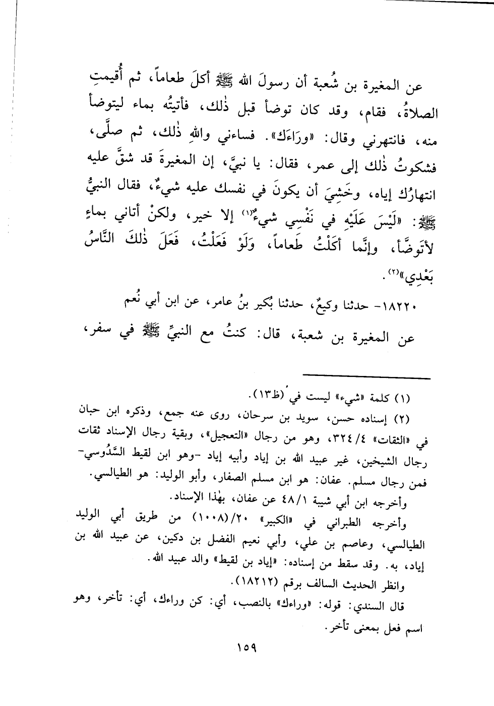 عَنِ الْمُغِيرَةِ بْنِ شُعْبَةَ، أَنَّ رَسُولَ اللهِ صَلَّى اللهُ عَلَيْهِ وَسَلَّمَ، أَكَلَ طَعَامًا، ثُمَّ أُقِيمَتِ الصَّلَاةُ، فَقَامَ، وَقَدْ كَانَ تَوَضَّأَ قَبْلَ ذَلِكَ، فَأَتَيْتُهُ بِمَاءٍ لِيَتَوَضَّأَ مِنْهُ، فَانْتَهَرَنِي وَقَالَ: " وَرَاءَكَ "، فَسَاءَنِي وَاللهِ ذَلِكَ، ثُمَّ صَلَّى، فَشَكَوْتُ ذَلِكَ إِلَى عُمَرَ، فَقَالَ: يَا نَبِيَّ اللهِ إِنَّ الْمُغِيرَةَ قَدْ شَقَّ عَلَيْهِ انْتِهَارُكَ إِيَّاهُ، وَخَشِيَ أَنْ يَكُونَ فِي نَفْسِكَ عَلَيْهِ شَيْءٌ، فَقَالَ النَّبِيُّ صَلَّى اللهُ عَلَيْهِ وَسَلَّمَ: " لَيْسَ عَلَيْهِ فِي نَفْسِي شَيْءٌ (١) إِلَّا خَيْرٌ، وَلَكِنْ أَتَانِي بِمَاءٍ لِأَتَوَضَّأَ، وَإِنَّمَا أَكَلْتُ طَعَامًا وَلَوْ فَعَلْتُ فَعَلَ ذَلِكَ النَّاسُ بَعْدِي " (٢)
