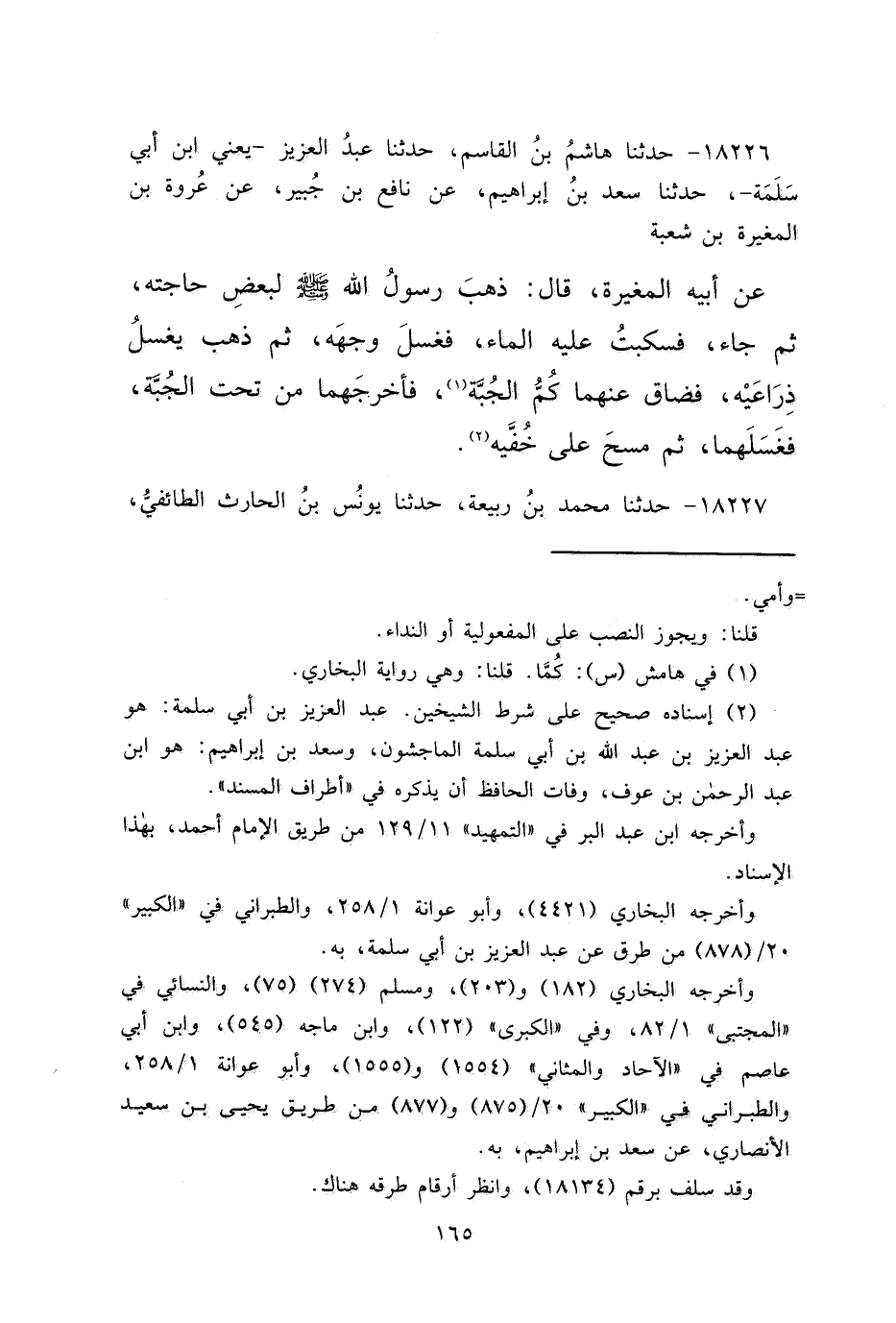 ١٨٢٢٦ - حَدَّثَنَا هَاشِمُ بْنُ الْقَاسِمِ، حَدَّثَنَا عَبْدُ الْعَزِيزِ يَعْنِي ابْنَ أَبِي سَلَمَةَ، حَدَّثَنَا سَعْدُ بْنُ إِبْرَاهِيمَ، عَنْ نَافِعِ بْنِ جُبَيْرٍ، عَنْ عُرْوَةَ بْنِ الْمُغِيرَةِ بْنِ شُعْبَةَ، عَنْ أَبِيهِ الْمُغِيرَةِ، قَالَ: " ذَهَبَ رَسُولُ اللهِ صَلَّى اللهُ عَلَيْهِ وَسَلَّمَ، لِبَعْضِ حَاجَتِهِ، ثُمَّ جَاءَ فَسَكَبْتُ عَلَيْهِ الْمَاءَ، فَغَسَلَ وَجْهَهُ، ثُمَّ ذَهَبَ يَغْسِلُ ذِرَاعَيْهِ، فَضَاقَ عَنْهُمَا كُمُّ الْجُبَّةِ (١) ، فَأَخْرَجَهُمَا مِنْ تَحْتِ الْجُبَّةِ، فَغَسَلَهُمَا ثُمَّ مَسَحَ عَلَى خُفَّيْهِ " (٢)