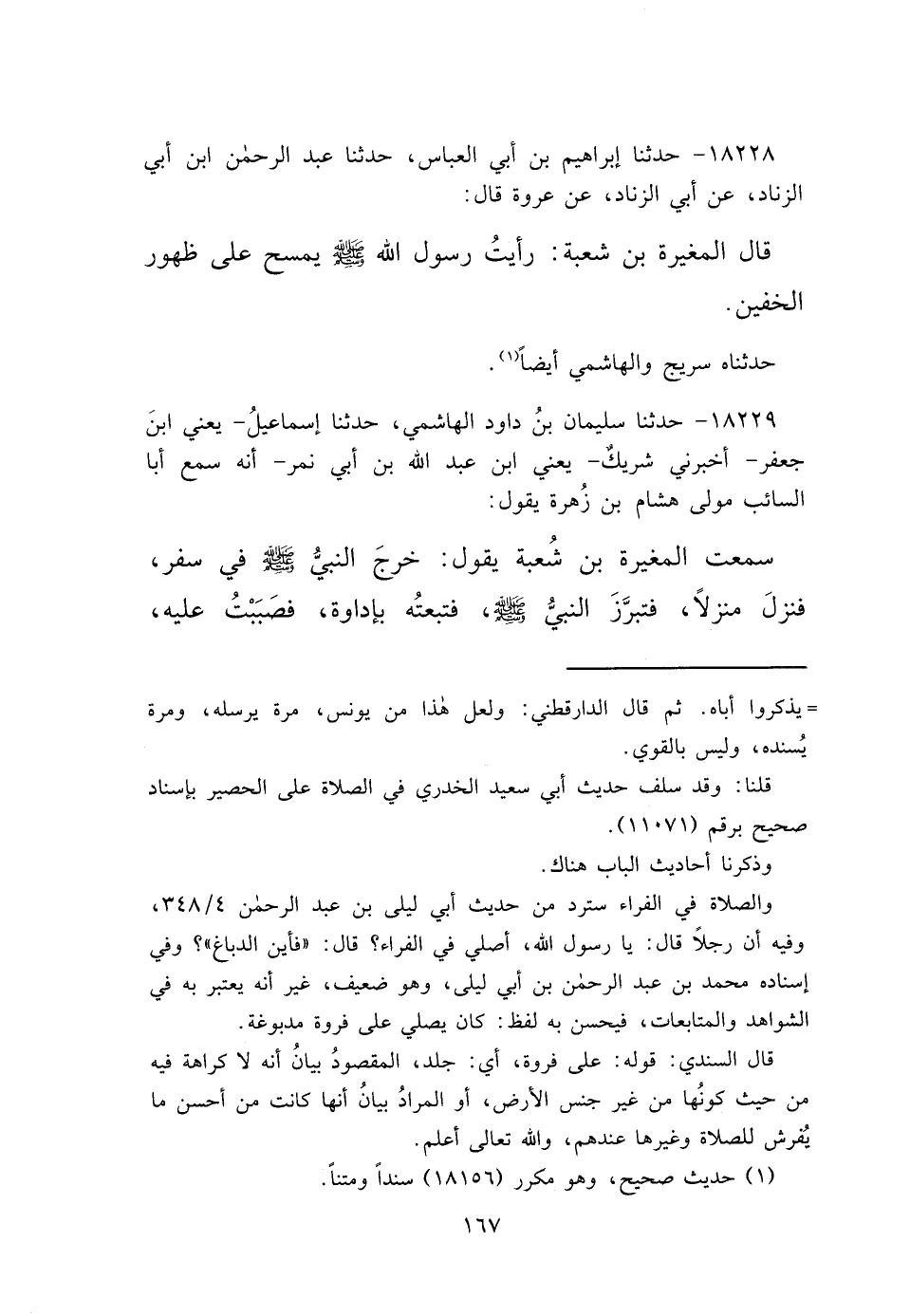 ١٨٢٢٨ - حَدَّثَنَا إِبْرَاهِيمُ بْنُ أَبِي الْعَبَّاسِ، حَدَّثَنَا عَبْدُ الرَّحْمَنِ بْنُ أَبِي الزِّنَادِ، عَنْ أَبِي الزِّنَادِ، عَنْ عُرْوَةَ، قَالَ: قَالَ الْمُغِيرَةُ بْنُ شُعْبَةَ: " رَأَيْتُ رَسُولَ اللهِ صَلَّى اللهُ عَلَيْهِ وَسَلَّمَ يَمْسَحُ عَلَى ظُهُورِ الْخُفَّيْنِ " حَدَّثَنَاهُ سُرَيْجٌ، والْهَاشِمِيُّ أَيْضًا (١)