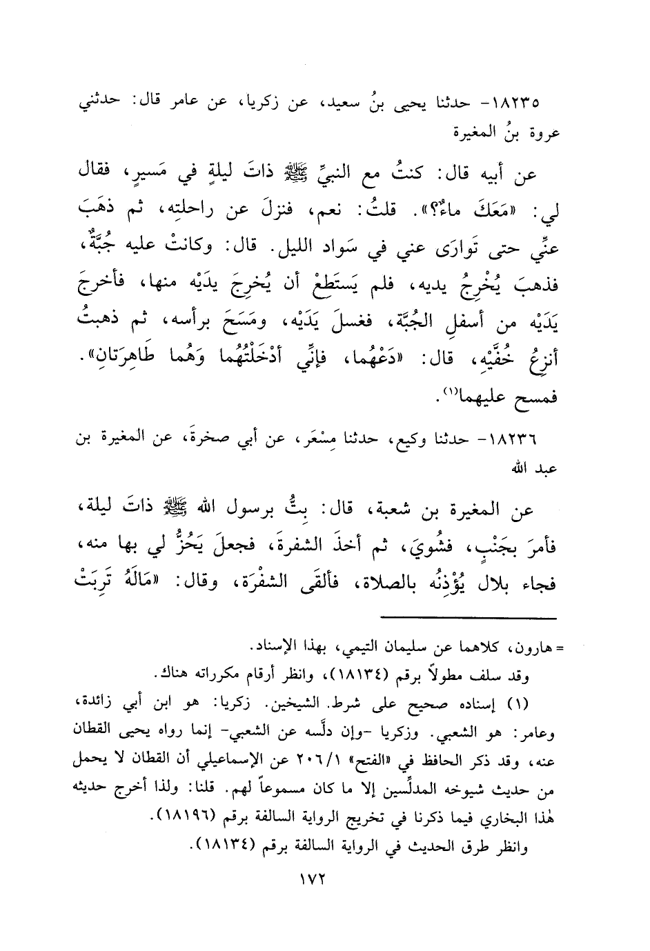 ١٨٢٣٥ - حَدَّثَنَا يَحْيَى بْنُ سَعِيدٍ، عَنْ زَكَرِيَّا، عَنْ عَامِرٍ، قَالَ: حَدَّثَنِي عُرْوَةُ بْنُ الْمُغِيرَةِ، عَنْ أَبِيهِ، قَالَ: كُنْتُ مَعَ النَّبِيِّ صَلَّى اللهُ عَلَيْهِ وَسَلَّمَ ذَاتَ لَيْلَةٍ فِي مَسِيرٍ، فَقَالَ لِي: " مَعَكَ مَاءٌ؟ " قُلْتُ: نَعَمْ، فَنَزَلَ عَنْ رَاحِلَتِهِ، ثُمَّ ذَهَبَ عَنِّي حَتَّى تَوَارَى عَنِّي فِي سَوَادِ اللَّيْلِ. قَالَ: وَكَانَتْ عَلَيْهِ جُبَّةٌ، فَذَهَبَ يُخْرِجُ يَدَيْهِ، فَلَمْ يَسْتَطِعْ أَنْ يُخْرِجَ يَدَيْهِ مِنْهَا، فَأَخْرَجَ يَدَيْهِ مِنْ أَسْفَلِ الْجُبَّةِ، فَغَسَلَ يَدَيْهِ وَمَسَحَ بِرَأْسِهِ، ثُمَّ ذَهَبْتُ أَنْزِعُ خُفَّيْهِ، قَالَ: " دَعْهُمَا فَإِنِّي أَدْخَلْتُهُمَا وَهُمَا طَاهِرَتَانِ " فَمَسَحَ عَلَيْهِمَا (١)