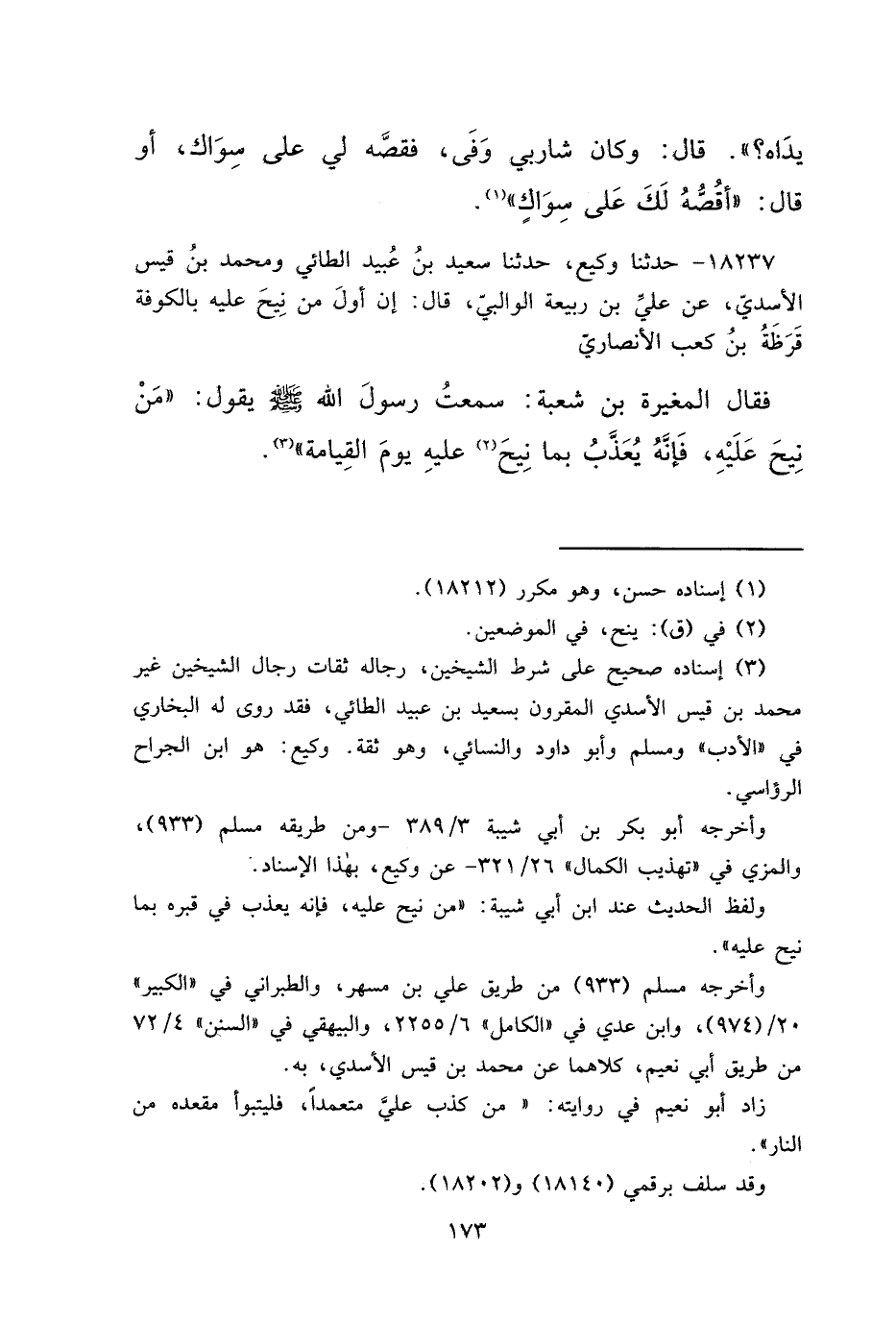 ١٨٢٣٧ - حَدَّثَنَا وَكِيعٌ، حَدَّثَنَا سَعِيدُ بْنُ عُبَيْدٍ الطَّائِيُّ، وَمُحَمَّدُ بْنُ قَيْسٍ الْأَسَدِيُّ، عَنْ عَلِيِّ بْنِ رَبِيعَةَ الْوَالِبِيِّ قَالَ: إِنَّ أَوَّلَ مِنْ نِيحَ عَلَيْهِ بِالْكُوفَةِ قَرَظَةُ بْنُ كَعْبٍ الْأَنْصَارِيُّ، فَقَالَ الْمُغِيرَةُ بْنُ شُعْبَةَ: سَمِعْتُ رَسُولَ اللهِ صَلَّى اللهُ عَلَيْهِ وَسَلَّمَ، يَقُولُ: " مَنْ نِيحَ عَلَيْهِ، فَإِنَّهُ يُعَذَّبُ بِمَا نِيحَ (٢) عَلَيْهِ يَوْمَ الْقِيَامَةِ " (٣)
