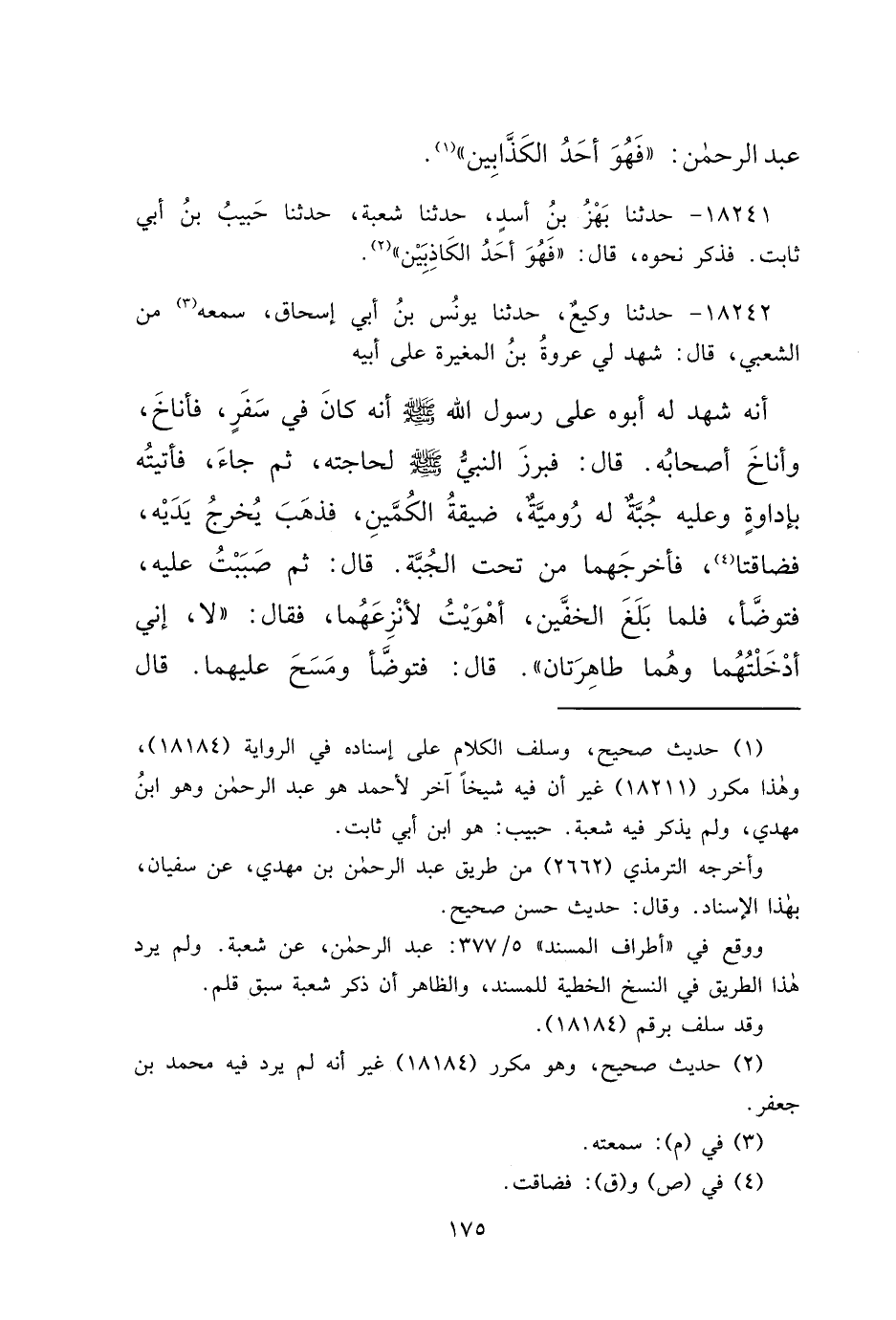 ١٨٢٤٢ - حَدَّثَنَا وَكِيعٌ، حَدَّثَنَا يُونُسُ بْنُ أَبِي إِسْحَاقَ، سَمِعَهُ (٣) مِنَ الشَّعْبِيِّ، قَالَ: شَهِدَ لِي عُرْوَةُ بْنُ الْمُغِيرَةِ، عَلَى أَبِيهِ، أَنَّهُ شَهِدَ لَهُ أَبُوهُ عَلَى رَسُولِ اللهِ صَلَّى اللهُ عَلَيْهِ وَسَلَّمَ، أَنَّهُ كَانَ فِي سَفَرٍ، فَأَنَاخَ، وَأَنَاخَ أَصْحَابُهُ، قَالَ: فَبَرَزَ النَّبِيُّ صَلَّى اللهُ عَلَيْهِ وَسَلَّمَ لِحَاجَتِهِ، ثُمَّ جَاءَ، فَأَتَيْتُهُ بِإِدَاوَةٍ وَعَلَيْهِ جُبَّةٌ لَهُ رُومِيَّةٌ، ضَيِّقَةُ الْكُمَّيْنِ، فَذَهَبَ يُخْرِجُ يَدَيْهِ، فَضَاقَتَا، (٤) فَأَخْرَجَهُمَا مِنْ تَحْتِ الْجُبَّةِ، قَالَ: ثُمَّ صَبَبْتُ عَلَيْهِ، فَتَوَضَّأَ، فَلَمَّا بَلَغَ الْخُفَّيْنِ، أَهْوَيْتُ لِأَنْزِعَهُمَا، فَقَالَ: " لَا، إِنِّي أَدْخَلْتُهُمَا وَهُمَا طَاهِرَتَانِ " قَالَ: فَتَوَضَّأَ، وَمَسَحَ عَلَيْهِمَا قَالَ