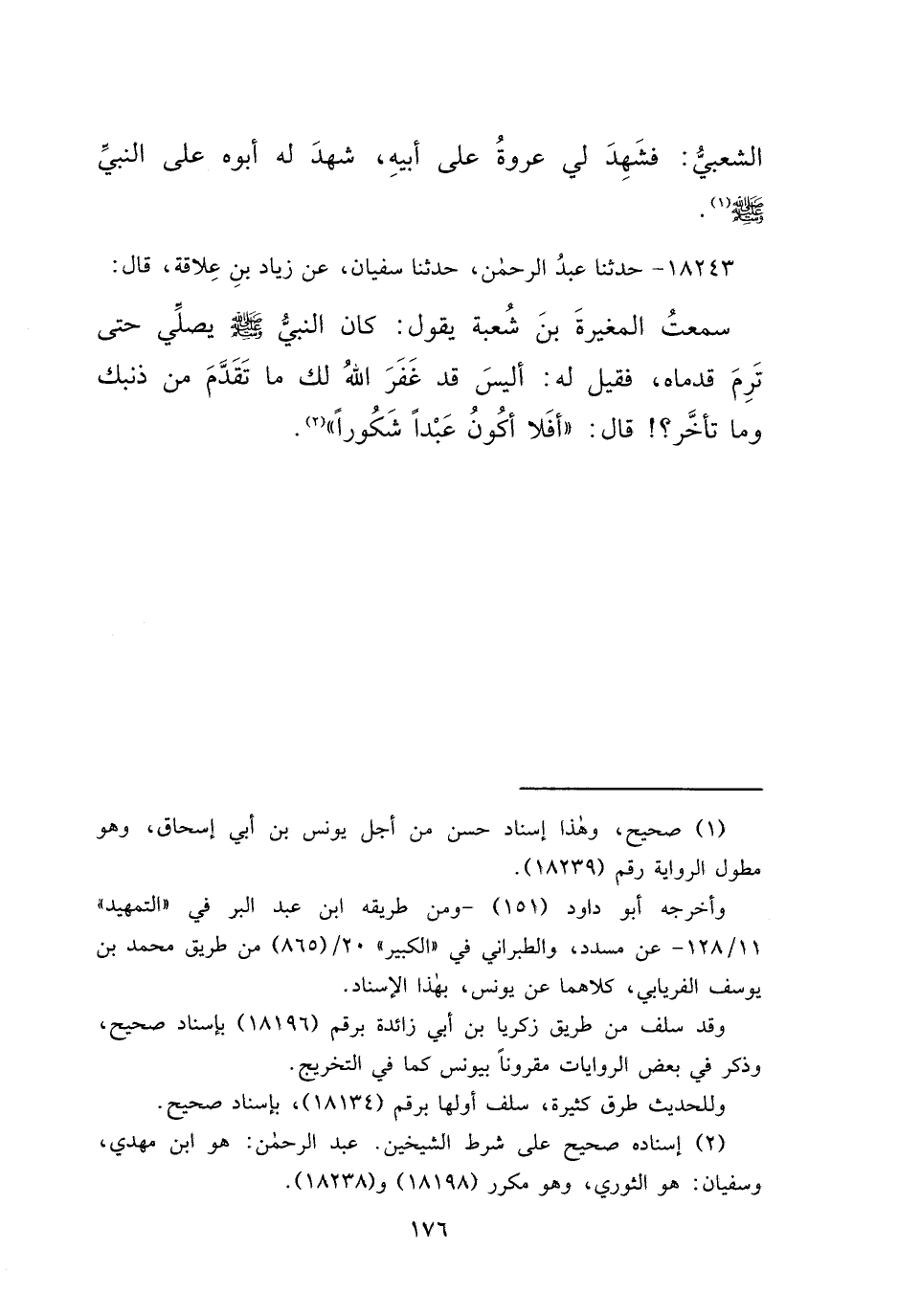 ١٨٢٤٣ - حَدَّثَنَا عَبْدُ الرَّحْمَنِ، حَدَّثَنَا سُفْيَانُ، عَنْ زِيَادِ بْنِ عِلَاقَةَ، قَالَ: سَمِعْتُ الْمُغِيرَةَ بْنَ شُعْبَةَ، يَقُولُ: كَانَ النَّبِيُّ صَلَّى اللهُ عَلَيْهِ وَسَلَّمَ يُصَلِّي حَتَّى تَرِمَ قَدَمَاهُ، فَقِيلَ لَهُ: أَلَيْسَ قَدْ غَفَرَ اللهُ لَكَ مَا تَقَدَّمَ مِنْ ذَنْبِكَ، وَمَا تَأَخَّرَ؟ قَالَ: " أَفَلَا أَكُونُ عَبْدًا شَكُورًا " (٢)