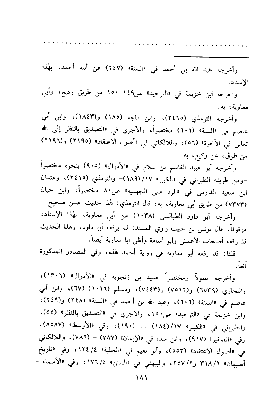 وأخرجه أبو عبيد القاصم بن سلام في "الأموال" (٩٠٥) بنحوه مختصراً - ومن طريقه الطبراني في "الكبير" ١٧/ (١٨٩) - والترمذي (٢٤١٥) ، وعثمان ابن سعيد الدارمي في "الرد على الجهمية" ص ٨٠ مختصراً، وابن حبان (٧٣٧٣) من طريق أبي معاوية، به، قال الترمذي: هذا حديث حسن صحيح.
