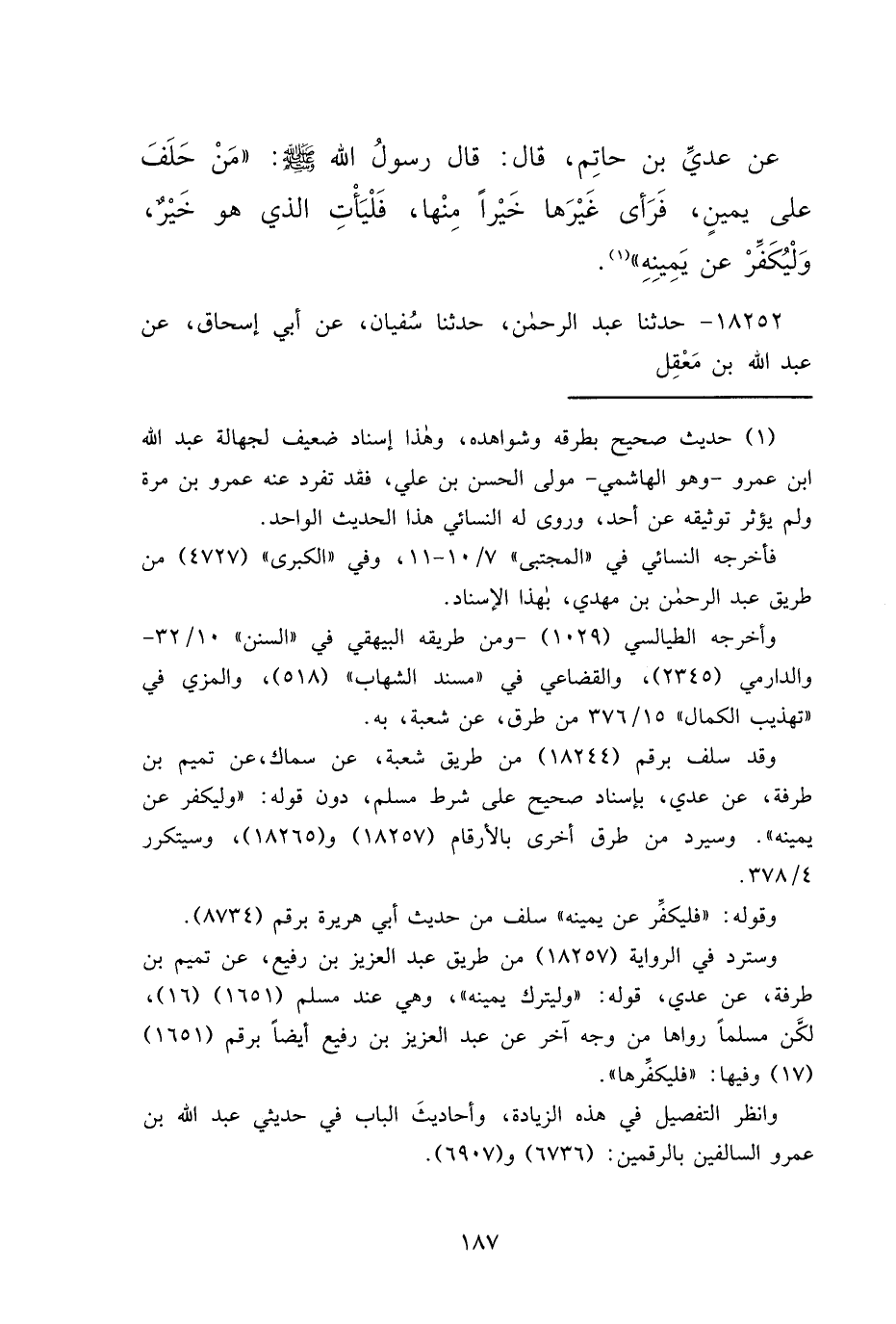 وسترد في الرواية (١٨٢٥٧) من طريق عبد العزيز بن رفيع، عن تميم بن طرفة، عن عدي، قوله: "وليترك يمينه"، وهي عند مسلم (١٦٥١) (١٦) ، لكن مسلماً رواها من وجه آخر عن عبد العزيز بن رفيع أيضا برقم (١٦٥١) (١٧) وفيها: " فليكفِّرها".