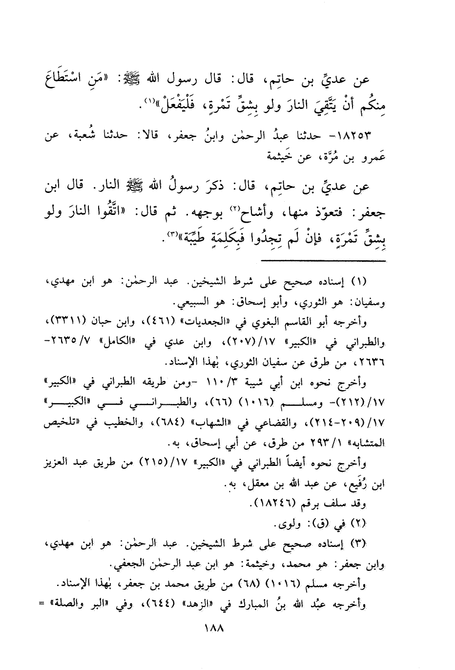 ١٨٢٥٣ - حَدَّثَنَا عَبْدُ الرَّحْمَنِ، وَابْنُ جَعْفَرٍ، قَالَا: حَدَّثَنَا شُعْبَةُ، عَنْ عَمْرِو بْنِ مُرَّةَ، عَنْ خَيْثَمَةَ، عَنْ عَدِيِّ بْنِ حَاتِمٍ، قَالَ: ذَكَرَ رَسُولُ اللهِ صَلَّى اللهُ عَلَيْهِ وَسَلَّمَ النَّارَ، قَالَ ابْنُ جَعْفَرٍ:، فَتَعَوَّذَ مِنْهَا، وَأَشَاحَ (٢) بِوَجْهِهِ، ثُمَّ قَالَ: " اتَّقُوا النَّارَ وَلَوْ بِشِقِّ تَمْرَةٍ، فَإِنْ لَمْ تَجِدُوا، فَبِكَلِمَةٍ طَيِّبَةٍ " (٣)