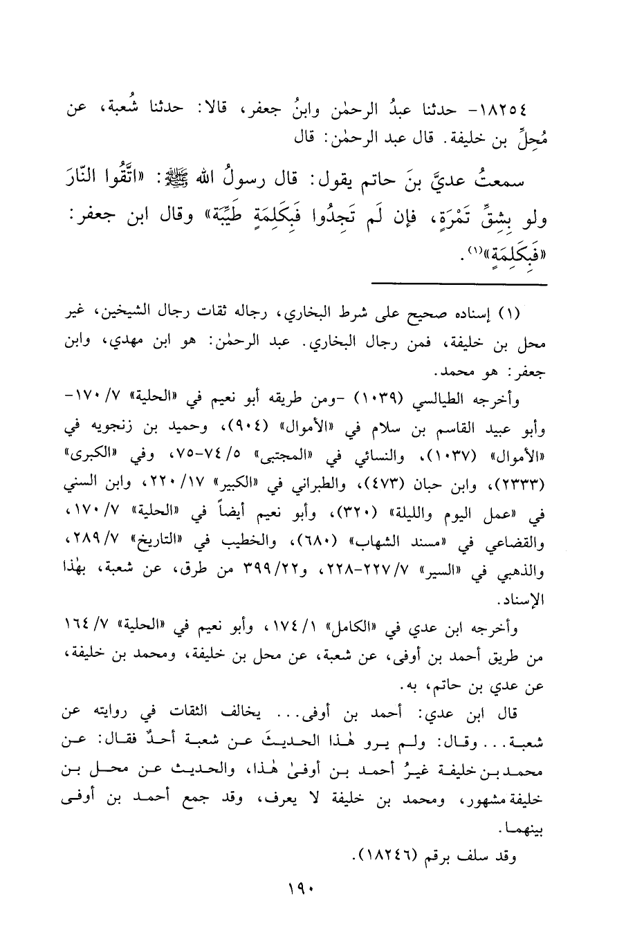 ١٨٢٥٤ - حَدَّثَنَا عَبْدُ الرَّحْمَنِ، وَابْنُ جَعْفَرٍ، قَالَا: حَدَّثَنَا شُعْبَةُ، عَنْ مُحِلِّ بْنِ خَلِيفَةَ، قَالَ عَبْدُ الرَّحْمَنِ: قَالَ: سَمِعْتُ عَدِيَّ بْنَ حَاتِمٍ، يَقُولُ: قَالَ رَسُولُ اللهِ صَلَّى اللهُ عَلَيْهِ وَسَلَّمَ: " اتَّقُوا النَّارَ وَلَوْ بِشِقِّ تَمْرَةٍ، فَإِنْ لَمْ تَجِدُوا، فَبِكَلِمَةٍ طَيِّبَةٍ " وَقَالَ ابْنُ جَعْفَرٍ: " فَبِكَلِمَةٍ " (١)