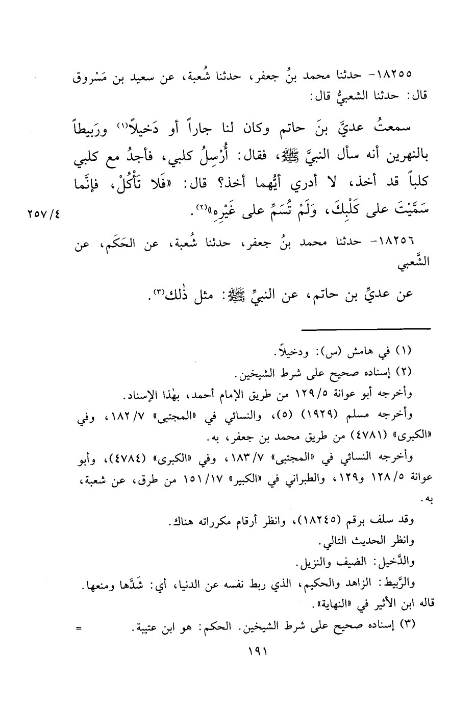 ١٨٢٥٦ - حَدَّثَنَا مُحَمَّدُ بْنُ جَعْفَرٍ، حَدَّثَنَا شُعْبَةُ، عَنِ الْحَكَمِ، عَنِ الشَّعْبِيِّ، عَنْ عَدِيِّ بْنِ حَاتِمٍ، عَنِ النَّبِيِّ صَلَّى اللهُ عَلَيْهِ وَسَلَّمَ مِثْلَ ذَلِكَ (٣)