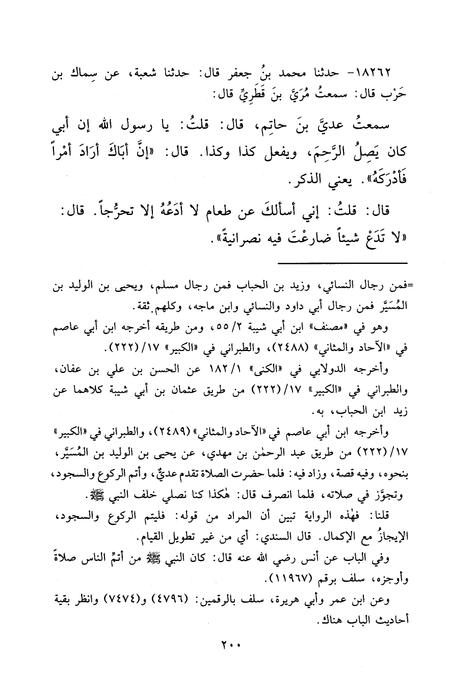 ١٨٢٦٢ - حَدَّثَنَا مُحَمَّدُ بْنُ جَعْفَرٍ، قَالَ: حَدَّثَنَا شُعْبَةُ، عَنْ سِمَاكِ بْنِ حَرْبٍ، قَالَ: سَمِعْتُ مُرَيَّ بْنَ قَطَرِيٍّ، قَالَ: سَمِعْتُ عَدِىَّ بْنَ حَاتِمٍ، قَالَ: قُلْتُ: يَا رَسُولَ اللهِ إِنَّ أَبِي كَانَ يَصِلُ الرَّحِمَ، وَيَفْعَلُ كَذَا وَكَذَا، قَالَ: " إِنَّ أَبَاكَ أَرَادَ أَمْرًا فَأَدْرَكَهُ، يَعْنِي الذِّكْرَ، " قَالَ: قُلْتُ: إِنِّي أَسْأَلُكَ عَنْ طَعَامٍ لَا أَدَعُهُ إِلَّا تَحَرُّجًا، قَالَ: " لَا تَدَعْ شَيْئًا ضَارَعْتَ فِيهِ نَصْرَانِيَّةً "،