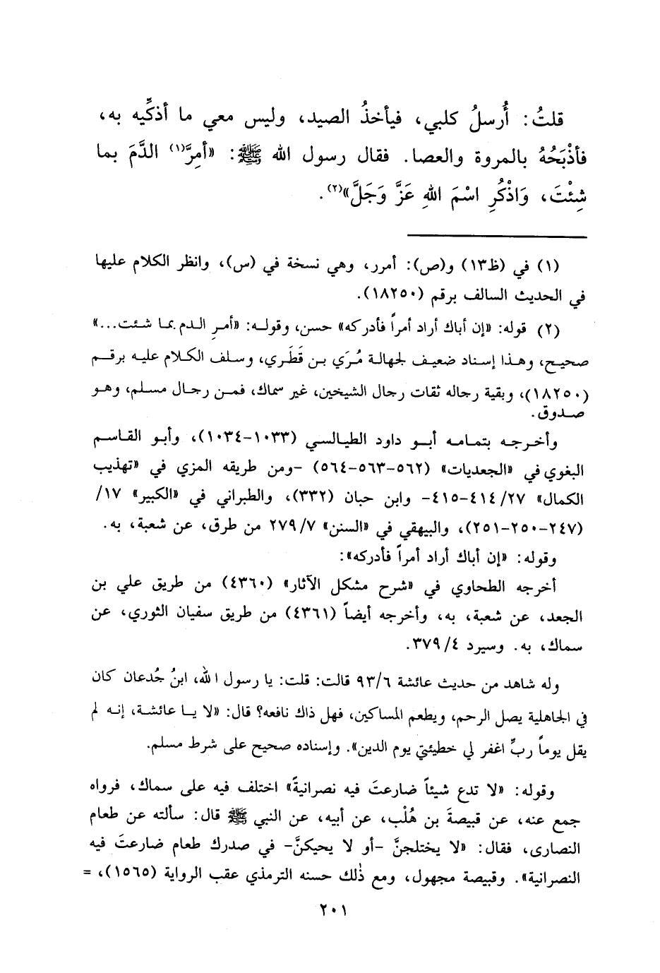 قُلْتُ: أُرْسِلُ كَلْبِي، فَيَأْخُذُ الصَّيْدَ وَلَيْسَ مَعِي مَا أُذَكِّيهِ بِهِ، فَأَذْبَحَهُ بِالْمَرْوَةِ، وَالْعَصَا، فَقَالَ رَسُولُ اللهِ صَلَّى اللهُ عَلَيْهِ وَسَلَّمَ: " أَمَرَّ (١) الدَّمَ بِمَا شِئْتَ، وَاذْكُرْ اسْمَ اللهِ عَزَّ وَجَلَّ (٢) "