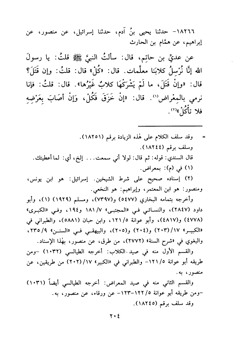 ١٨٢٦٦ - حَدَّثَنَا يَحْيَى بْنُ آدَمَ، حَدَّثَنَا إِسْرَائِيلُ، عَنْ مَنْصُورٍ، عَنْ إِبْرَاهِيمَ، عَنْ هَمَّامِ بْنِ الْحَارِثِ، عَنْ عَدِيِّ بْنِ حَاتِمٍ، قَالَ: سَأَلْتُ النَّبِيَّ صَلَّى اللهُ عَلَيْهِ وَسَلَّمَ، قُلْتُ: يَا رَسُولَ اللهِ، إِنَّا نُرْسِلُ كِلَابَنَا مُعَلَّمَاتٍ، قَالَ: " كُلْ " قَالَ: قُلْتُ: وَإِنْ قَتَلَ؟ قَالَ: " وَإِنْ قَتَلَ، مَا لَمْ يَشْرَكْهَا كِلَابٌ غَيْرُهَا "