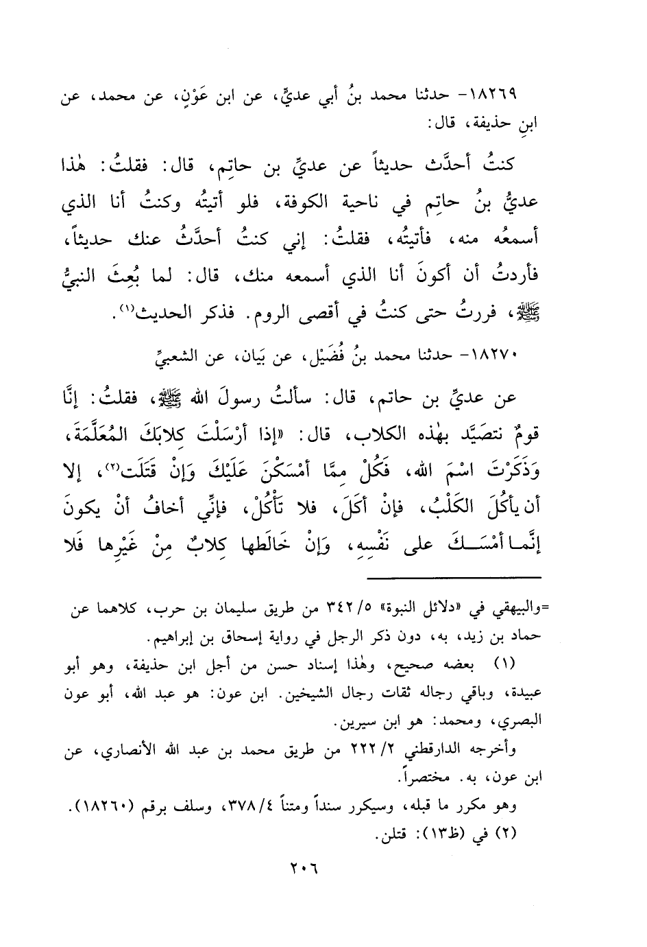 ١٨٢٦٩ - حَدَّثَنَا مُحَمَّدُ بْنُ أَبِي عَدِيٍّ، عَنِ ابْنِ عَوْنٍ، عَنْ مُحَمَّدٍ عَنِ ابْنِ حُذَيْفَةَ، قَالَ: كُنْتُ أُحَدِّثُ حَدِيثًا عَنْ عَدِيِّ بْنِ حَاتِمٍ، قَالَ: فَقُلْتُ: هَذَا عَدِيُّ بْنُ حَاتِمٍ فِي نَاحِيَةِ الْكُوفَةِ، فَلَوْ أَتَيْتُهُ وَكُنْتُ أَنَا الَّذِي أَسْمَعُهُ مِنْهُ، فَأَتَيْتُهُ، فَقُلْتُ: إِنِّي كُنْتُ أُحَدَّثُ عَنْكَ حَدِيثًا، فَأَرَدْتُ أَنْ أَكُونَ أَنَا الَّذِي أَسْمَعُهُ مِنْكَ، قَالَ: لَمَّا بُعِثَ النَّبِيُّ صَلَّى اللهُ عَلَيْهِ وَسَلَّمَ، فَرَرْتُ حَتَّى كُنْتُ فِي أَقْصَى الرُّومِ فَذَكَرَ الْحَدِيثَ (١)