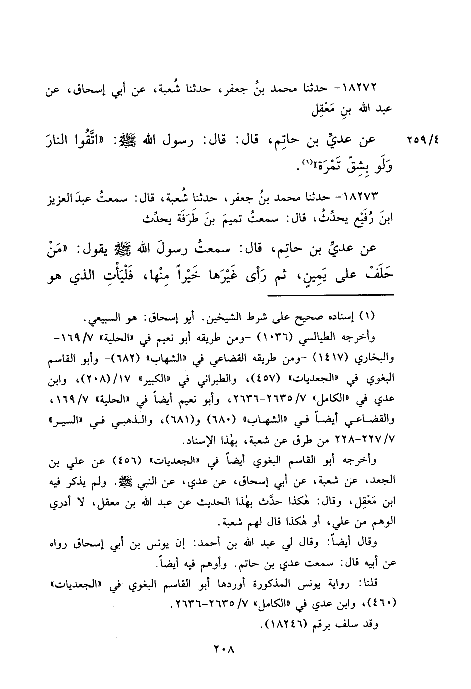 ١٨٢٧٢ - حَدَّثَنَا مُحَمَّدُ بْنُ جَعْفَرٍ، حَدَّثَنَا شُعْبَةُ، عَنْ أَبِي إِسْحَاقَ، عَنْ عَبْدِ اللهِ بْنِ مَعْقِلٍ، عَنْ عَدِيِّ بْنِ حَاتِمٍ الطَّائِيِّ، قَالَ: قَالَ رَسُولُ اللهِ صَلَّى اللهُ عَلَيْهِ وَسَلَّمَ: " اتَّقُوا النَّارَ وَلَوْ بِشِقِّ تَمْرَةٍ " (١)