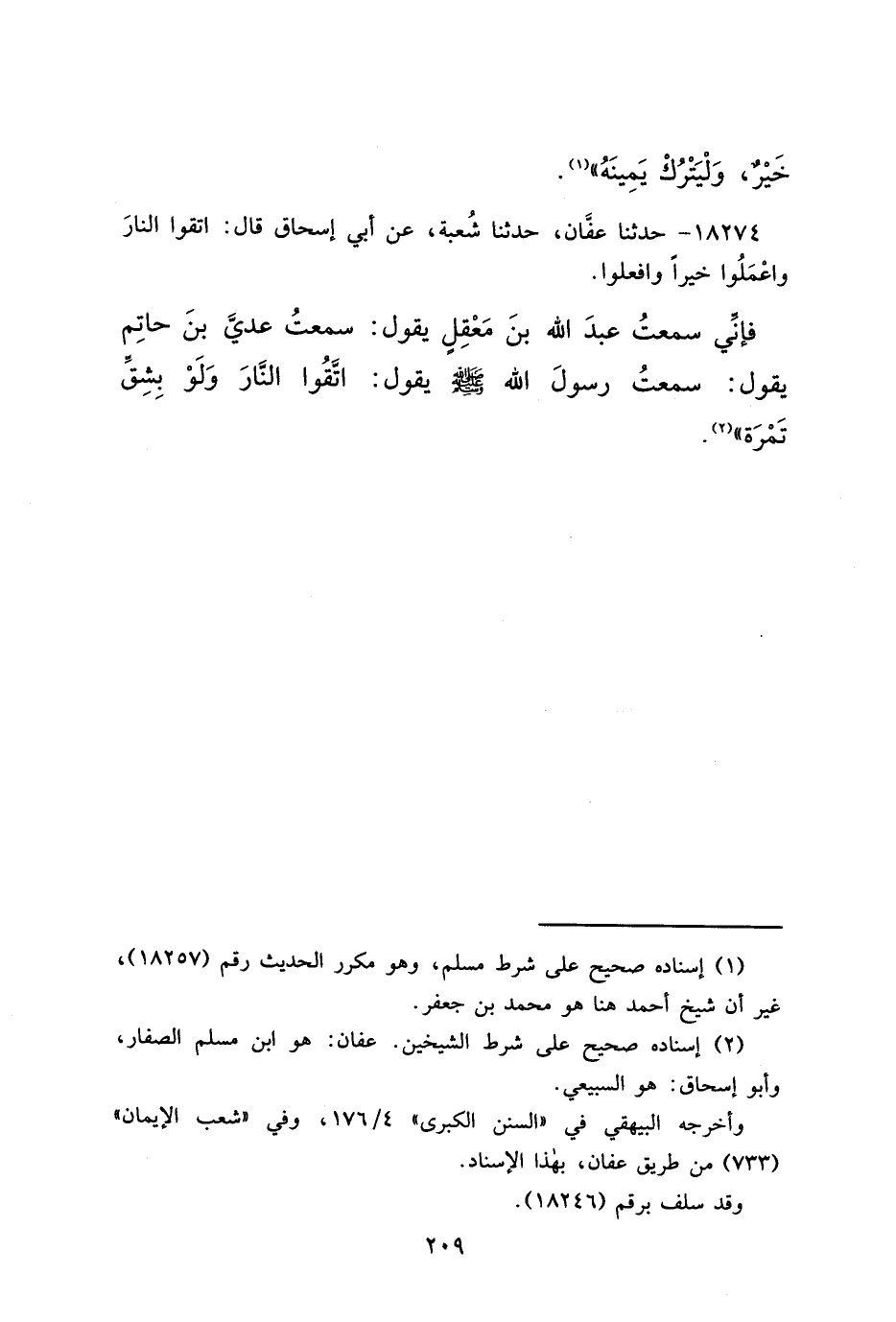 ١٨٢٧٤ - حَدَّثَنَا عَفَّانُ، حَدَّثَنَا شُعْبَةُ، عَنْ أَبِي إِسْحَاقَ، قَالَ: اتَّقُوا النَّارَ، وَاعْمَلُوا خَيْرًا، وَافْعَلُوا، فَإِنِّي سَمِعْتُ عَبْدَ اللهِ بْنَ مَعْقِلٍ، يَقُولُ: سَمِعْتُ عَدِيَّ بْنَ حَاتِمٍ يَقُولُ: سَمِعْتُ رَسُولَ اللهِ صَلَّى اللهُ عَلَيْهِ وَسَلَّمَ يَقُولُ: " اتَّقُوا النَّارَ، وَلَوْ بِشِقِّ تَمْرَةٍ " (٢)