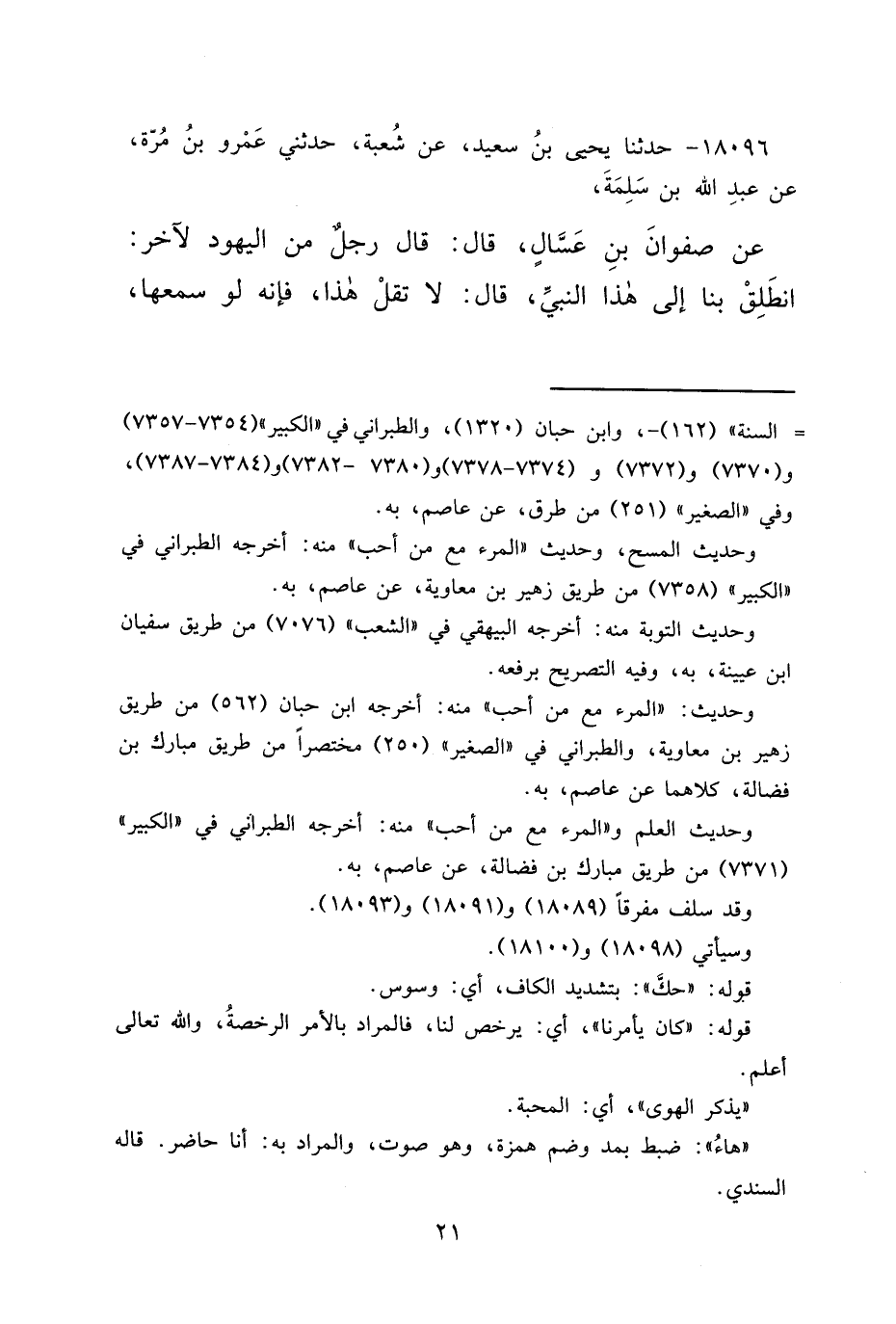 ١٨٠٩٦ - حَدَّثَنَا يَحْيَى بْنُ سَعِيدٍ، عَنْ شُعْبَةَ، حَدَّثَنِي عَمْرُو بْنُ مُرَّةَ، عَنْ عَبْدِ اللهِ بْنِ سَلَمَةَ، عَنْ صَفْوَانَ بْنِ عَسَّالٍ، قَالَ: قَالَ رَجُلٌ مِنَ الْيَهُودِ لِآخَرَ: انْطَلِقْ بِنَا إِلَى هَذَا النَّبِيِّ، قَالَ: لَا تَقُلْ هَذَا، فَإِنَّهُ لَوْ سَمِعَهَا،