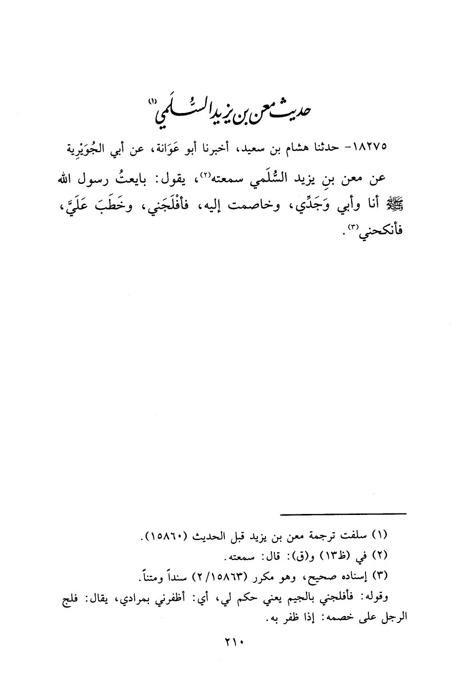 ١٨٢٧٥ - حَدَّثَنَا هِشَامُ بْنُ سَعِيدٍ، أَخْبَرَنَا أَبُو عَوَانَةَ، عَنْ أَبِي الْجُوَيْرِيَةِ، عَنْ مَعْنِ بْنِ يَزِيدَ السُّلَمِيِّ، سَمِعْتُهُ (٢) يَقُولُ: " بَايَعْتُ رَسُولَ اللهِ صَلَّى اللهُ عَلَيْهِ وَسَلَّمَ أَنَا وَأَبِي وَجَدِّي، وَخَاصَمْتُ إِلَيْهِ، فَأَفْلَجَنِي، وَخَطَبَ عَلَيَّ، فَأَنْكَحَنِي " (٣)