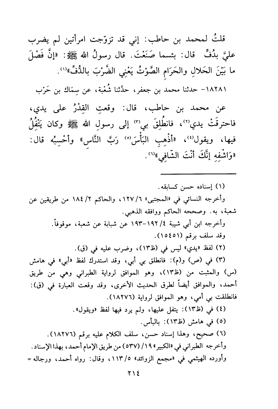 ١٨٢٨١ - حَدَّثَنَا مُحَمَّدُ بْنُ جَعْفَرٍ، حَدَّثَنَا شُعْبَةُ، عَنْ سِمَاكِ بْنِ حَرْبٍ، عَنْ مُحَمَّدِ بْنِ حَاطِبٍ، قَالَ: وَقَعَتِ الْقِدْرُ عَلَى يَدِي، فَاحْتَرَقَتْ يَدِي (٢) ، فَانْطَلَقَ بِي (٣) أَبِي إِلَى رَسُولِ اللهِ صَلَّى اللهُ عَلَيْهِ وَسَلَّمَ، وَكَانَ يَتْفُلُ فِيهَا، وَيَقُولُ (٤) : " أَذْهِبِ الْبَأَسَ (٥) رَبَّ النَّاسِ " وَأَحْسِبُهُ قَالَ: " وَاشْفِهِ إِنَّكَ أَنْتَ الشَّافِي " (٦)