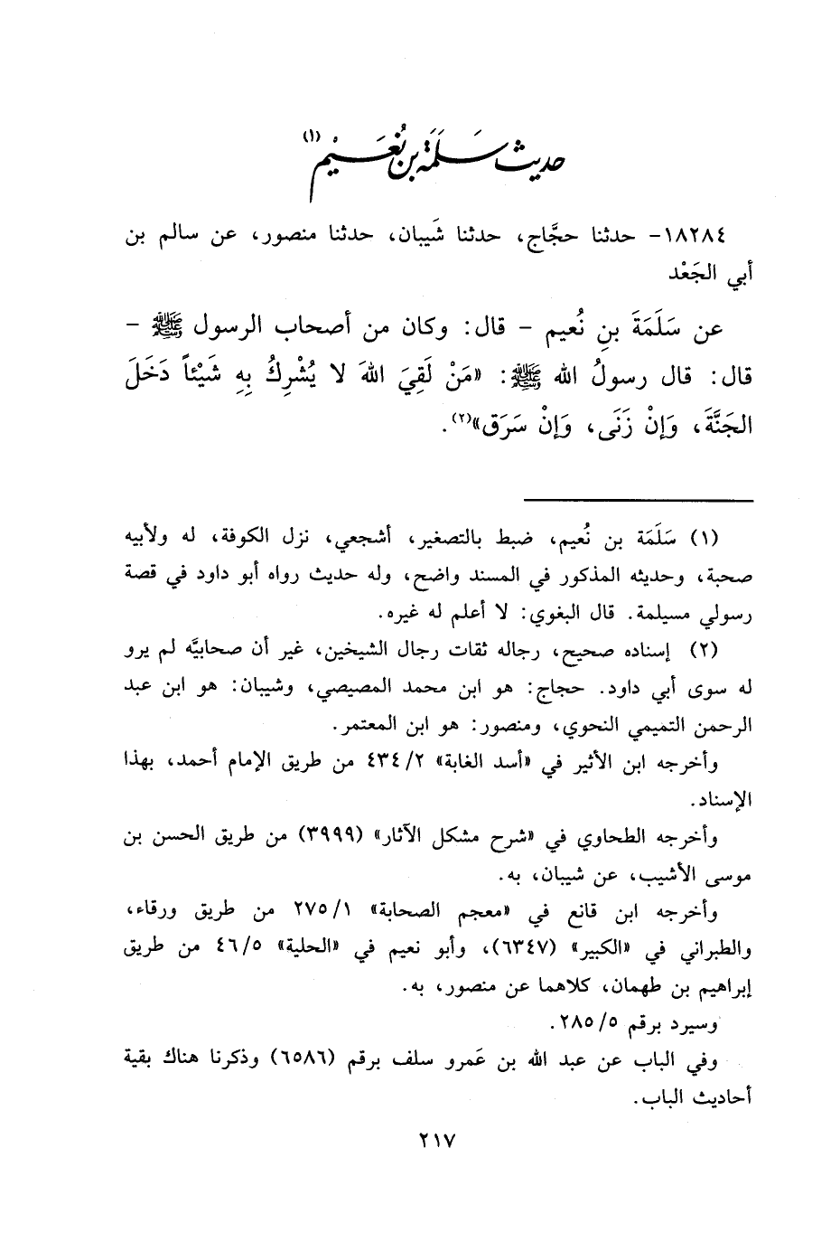 ١٨٢٨٤ - حَدَّثَنَا حَجَّاجٌ، حَدَّثَنَا شَيْبَانُ، حَدَّثَنَا مَنْصُورٌ، عَنْ سَالِمِ بْنِ أَبِي الْجَعْدِ، عَنْ سَلَمَةَ بْنِ نُعَيْمٍ، قَالَ: وَكَانَ مِنْ أَصْحَابِ الرَّسُولِ صَلَّى اللهُ عَلَيْهِ وَسَلَّمَ، قَالَ: قَالَ رَسُولُ اللهِ صَلَّى اللهُ عَلَيْهِ وَسَلَّمَ: " مَنْ لَقِيَ اللهَ لَا يُشْرِكُ بِهِ شَيْئًا دَخَلَ الْجَنَّةَ، وَإِنْ زَنَى، وَإِنْ سَرَقَ " (٢)