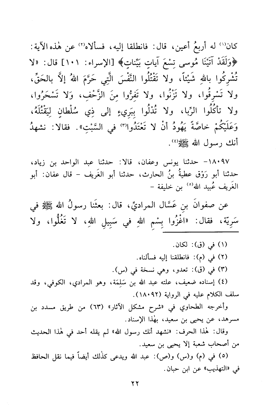 كَانَ (١) لَهُ أَرْبَعُ أَعْيُنٍ، قَالَ: فَانْطَلَقْنَا إِلَيْهِ، فَسَأَلَاهُ (٢) عَنْ هَذِهِ الْآيَةِ: {وَلَقَدْ آتَيْنَا مُوسَى تِسْعَ آيَاتٍ بَيِّنَاتٍ} [الإسراء: ١٠١] ، قَالَ: " لَا تُشْرِكُوا بِاللهِ شَيْئًا، وَلَا تَقْتُلُوا النَّفْسَ الَّتِي حَرَّمَ اللهُ إِلَّا بِالْحَقِّ، وَلَا تَسْرِقُوا، وَلَا تَزْنُوا، وَلَا تَفِرُّوا مِنَ الزَّحْفِ وَلَا تَسْحَرُوا، وَلَا تَأْكُلُوا الرِّبَا، وَلَا تُدْلُوا بِبَرِيءٍ إِلَى ذِي سُلْطَانٍ لِيَقْتُلَهُ، وَعَلَيْكُمْ خَاصَّةً يَهُودُ أَنْ لَا تَعْتَدُوا (٣) فِي السَّبْتِ " فَقَالَا: نَشْهَدُ إِنَّكَ رَسُولُ اللهِ صَلَّى اللهُ عَلَيْهِ وَسَلَّمَ (٤)