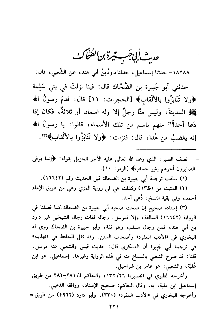 ١٨٢٨٨ - حَدَّثَنَا إِسْمَاعِيلُ، حَدَّثَنَا دَاوُدُ بْنُ أَبِي هِنْدٍ، عَنِ الشَّعْبِيِّ، قَالَ: حَدَّثَنِي أَبُو جَبِيرَةَ بْنُ الضَّحَّاكِ قَالَ: فِينَا نَزَلَتْ فِي بَنِي سَلِمَةَ {وَلَا تَنَابَزُوا بِالْأَلْقَابِ} [الحجرات: ١١] قَالَ: قَدِمَ رَسُولُ اللهِ صَلَّى اللهُ عَلَيْهِ وَسَلَّمَ الْمَدِينَةَ، وَلَيْسَ مِنَّا رَجُلٌ إِلَّا وَلَهُ اسْمَانِ أَوْ ثَلَاثَةٌ، فَكَانَ إِذَا دَعَا أَحَدًا (٢) مِنْهُمْ بِاسْمٍ مِنْ تِلْكَ الْأَسْمَاءِ، قَالُوا: يَا رَسُولَ اللهِ إِنَّهُ يَغْضَبُ مِنْ هَذَا: قَالَ: فَنَزَلَتْ: {وَلَا تَنَابَزُوا بِالْأَلْقَابِ} (٣)