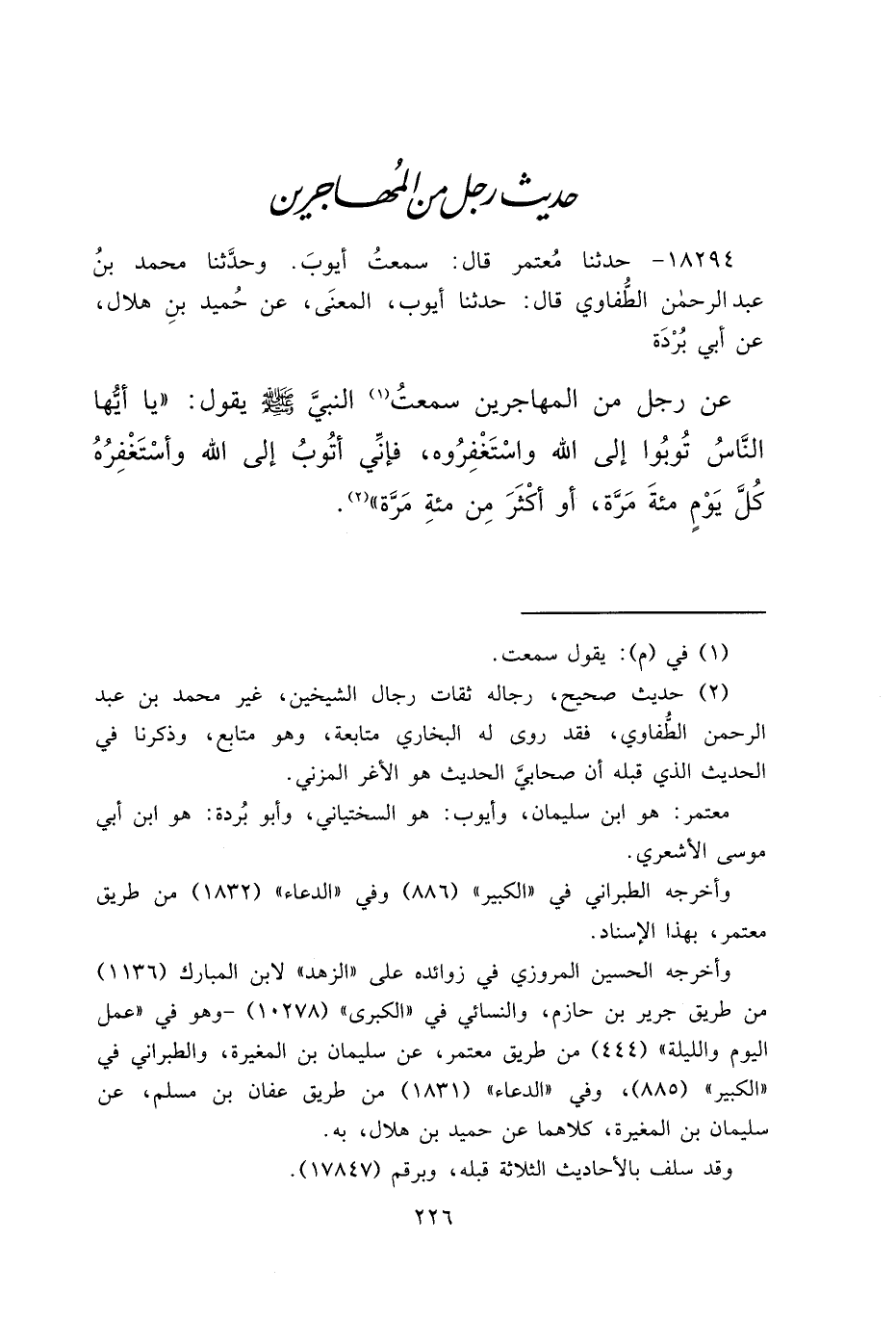 ١٨٢٩٤ - حَدَّثَنَا مُعْتَمِرٌ، قَالَ: سَمِعْتُ أَيُّوبَ، قَالَ: وَحَدَّثَنَا مُحَمَّدُ بْنُ عَبْدِ الرَّحْمَنِ الطُّفَاوِيُّ، قَالَ: حَدَّثَنَا أَيُّوبُ الْمَعْنَي، عَنْ حُمَيْدِ بْنِ هِلَالٍ، عَنْ أَبِي بُرْدَةَ، عَنْ رَجُلٍ، مِنَ الْمُهَاجِرِينَ سَمِعْتُ (١) النَّبِيَّ صَلَّى اللهُ عَلَيْهِ وَسَلَّمَ، يَقُولُ: " يَا أَيُّهَا النَّاسُ، تُوبُوا إِلَى اللهِ، وَاسْتَغْفِرُوهُ، فَإِنِّي أَتُوبُ إِلَى اللهِ، وَأَسْتَغْفِرُهُ فِي كُلِّ يَوْمٍ مِائَةَ مَرَّةٍ أَوْ أَكْثَرَ مِنْ مِائَةِ مَرَّةٍ " (٢)