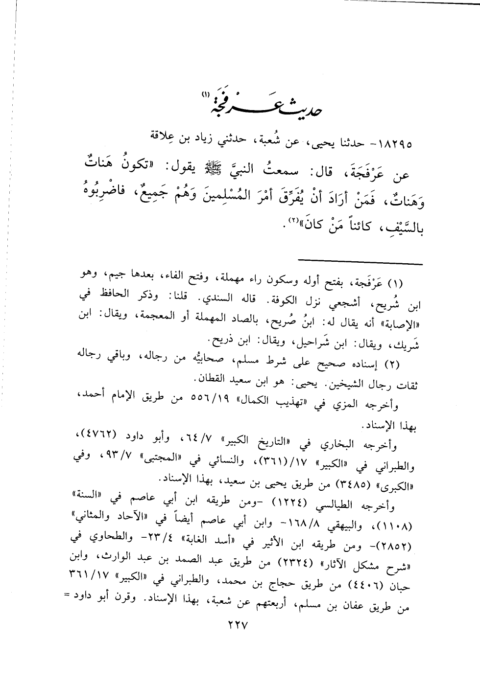 ١٨٢٩٥ - حَدَّثَنَا يَحْيَى، عَنْ شُعْبَةَ، حَدَّثَنِي زِيَادُ بْنُ عِلَاقَةَ، عَنْ عَرْفَجَةَ، قَالَ: سَمِعْتُ النَّبِيَّ صَلَّى اللهُ عَلَيْهِ وَسَلَّمَ، يَقُولُ: " تَكُونُ هَنَاتٌ وَهَنَاتٌ، فَمَنْ أَرَادَ أَنْ يُفَرِّقَ أَمْرَ الْمُسْلِمِينَ وَهُمْ جَمِيعٌ، فَاضْرِبُوهُ بِالسَّيْفِ، كَائِنًا مَنْ كَانَ " (٢)