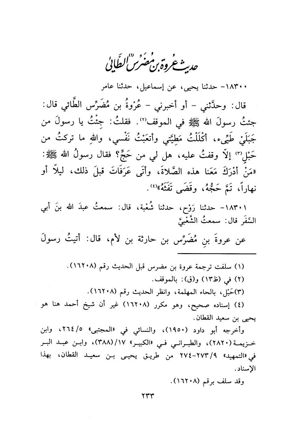 ١٨٣٠٠ - حَدَّثَنَا يَحْيَى، عَنْ إِسْمَاعِيلَ، حَدَّثَنَا عَامِرٌ، قَالَ: وَحَدَّثَنِي، أَوْ أَخْبَرَنِي، عُرْوَةُ بْنُ مُضَرِّسٍ الطَّائِيُّ، قَالَ: جِئْتُ رَسُولَ اللهِ صَلَّى اللهُ عَلَيْهِ وَسَلَّمَ فِي الْمَوْقِفِ (٢) ، فَقُلْتُ: جِئْتُ يَا رَسُولَ اللهِ مِنْ جَبَلَيْ طَيِّئٍ، أَكْلَلْتُ مَطِيَّتِي، وَأَتْعَبْتُ نَفْسِي، وَاللهِ مَا تَرَكْتُ مِنْ حَبَلٍ (٣) إِلَّا وَقَفْتُ عَلَيْهِ، هَلْ لِي مِنْ حَجٍّ؟ فَقَالَ رَسُولُ اللهِ صَلَّى اللهُ عَلَيْهِ وَسَلَّمَ: " مَنْ أَدْرَكَ مَعَنَا هَذِهِ الصَّلَاةَ، وَأَتَى عَرَفَاتٍ قَبْلَ ذَلِكَ، لَيْلًا أَوْ نَهَارًا، تَمَّ حَجُّهُ، وَقَضَى تَفَثَهُ " (٤)