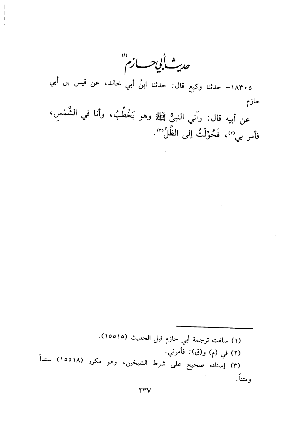 ١٨٣٠٥ - حَدَّثَنَا وَكِيعٌ، قَالَ: حَدَّثَنَا ابْنُ أَبِي خَالِدٍ، عَنْ قَيْسِ بْنِ أَبِي حَازِمٍ، عَنْ أَبِيهِ، قَالَ: " رَآنِي النَّبِيُّ صَلَّى اللهُ عَلَيْهِ وَسَلَّمَ، وَهُوَ يَخْطُبُ، وَأَنَا فِي الشَّمْسِ، فَأَمَرَ بِي (٢) ، فَحَوَّلْتُ إِلَى الظِّلِّ " (٣)