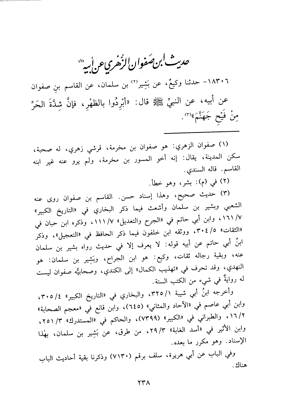 ١٨٣٠٦ - حَدَّثَنَا وَكِيعٌ، عَنْ بَشِيرِ (٢) بْنِ سَلْمَانَ، عَنِ الْقَاسِمِ بْنِ صَفْوَانَ، عَنْ أَبِيهِ، عَنِ النَّبِيِّ صَلَّى اللهُ عَلَيْهِ وَسَلَّمَ، قَالَ: " أَبْرِدُوا بِالظُّهْرِ، فَإِنَّ شِدَّةَ الْحَرِّ مِنْ فَيْحِ جَهَنَّمَ " (٣)