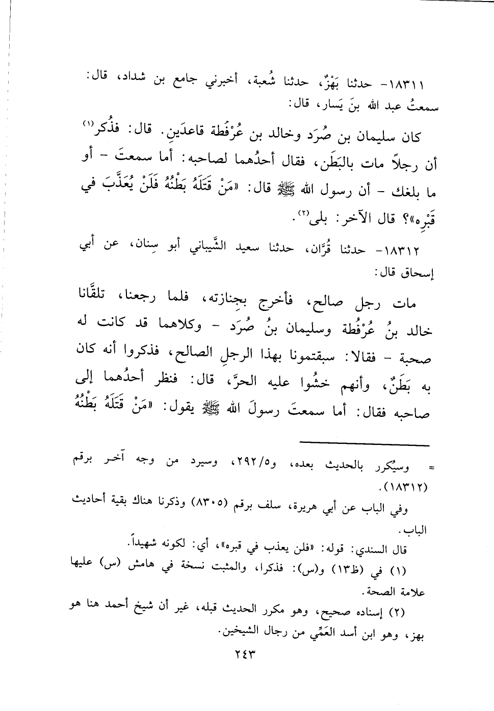 ١٨٣١١ - حَدَّثَنَا بَهْزٌ، حَدَّثَنَا شُعْبَةُ، أَخْبَرَنِي جَامِعُ بْنُ شَدَّادٍ، قَالَ: سَمِعْتُ عَبْدَ اللهِ بْنَ يَسَارٍ، قَالَ: كَانَ سُلَيْمَانُ بْنُ صُرَدٍ، وَخَالِدُ بْنُ عُرْفُطَةَ قَاعِدَيْنِ قَالَ: فَذُكِرَ (١) أَنَّ رَجُلًا مَاتَ بِالْبَطْنِ، فَقَالَ أَحَدُهُمَا لِصَاحِبِهِ: أَمَا سَمِعْتَ، أَوَمَا بَلَغَكَ، أَنَّ رَسُولَ اللهِ صَلَّى اللهُ عَلَيْهِ وَسَلَّمَ، قَالَ: " مَنْ قَتَلَهُ بَطْنُهُ، فَلَنْ يُعَذَّبَ فِي قَبْرِهِ "؟ قَالَ الْآخَرُ: بَلَى (٢)