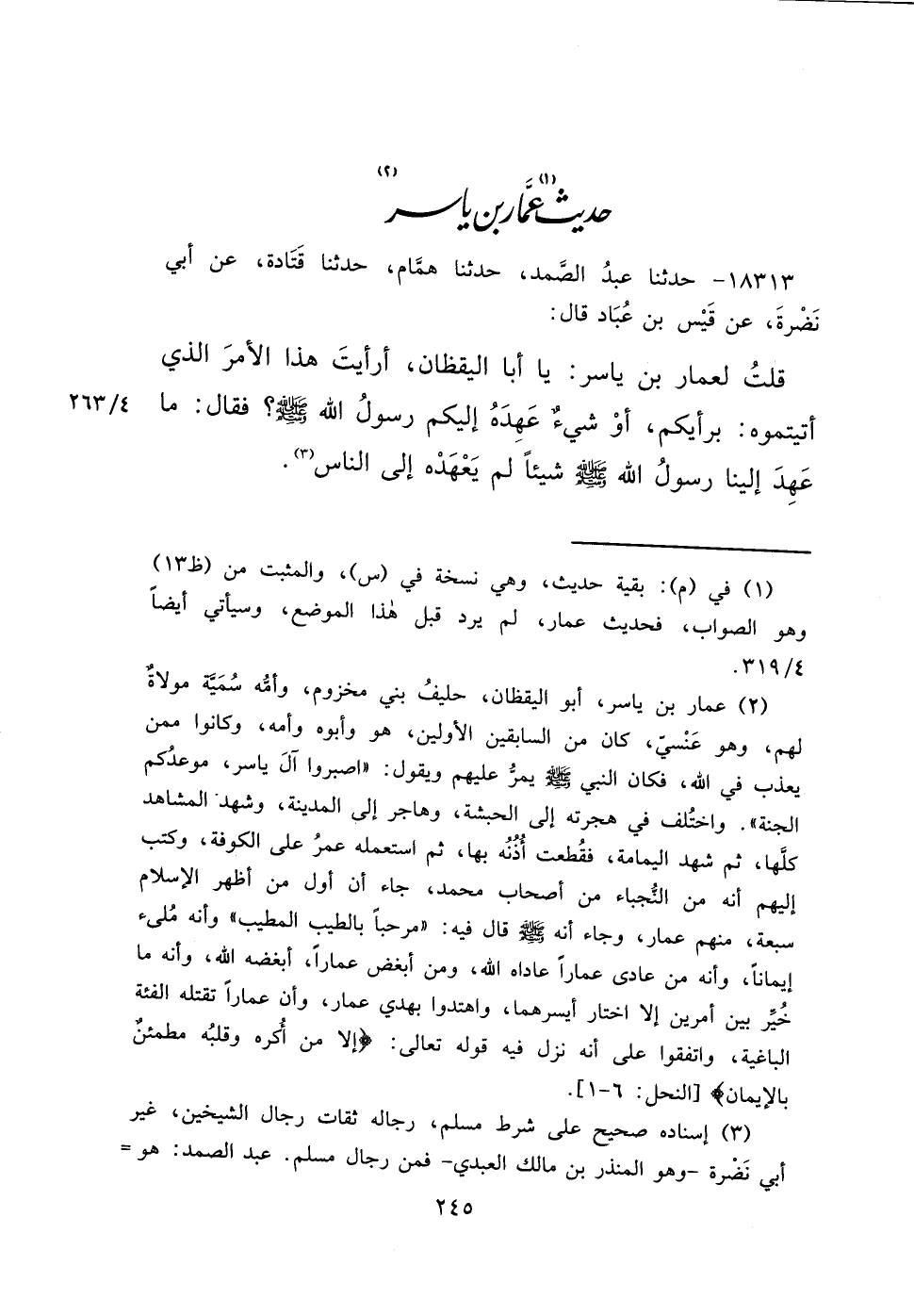١٨٣١٣ - حَدَّثَنَا عَبْدُ الصَّمَدِ، حَدَّثَنَا هَمَّامٌ، حَدَّثَنَا قَتَادَةُ، عَنْ أَبِي نَضْرَةَ، عَنْ قَيْسِ بْنِ عَبَّادٍ، قَالَ: قُلْتُ لِعَمَّارِ بْنِ يَاسِرٍ: يَا أَبَا الْيَقْظَانِ، أَرَأَيْتَ هَذَا الْأَمْرَ الَّذِي أَتَيْتُمُوهُ: بِرَأْيِكُمْ، أَوْ شَيْءٌ عَهِدَهُ إِلَيْكُمْ رَسُولُ اللهِ صَلَّى اللهُ عَلَيْهِ وَسَلَّمَ؟ فَقَالَ: " مَا عَهِدَ إِلَيْنَا رَسُولُ اللهِ صَلَّى اللهُ عَلَيْهِ وَسَلَّمَ شَيْئًا لَمْ يَعْهَدْهُ إِلَى النَّاسِ " (٣)