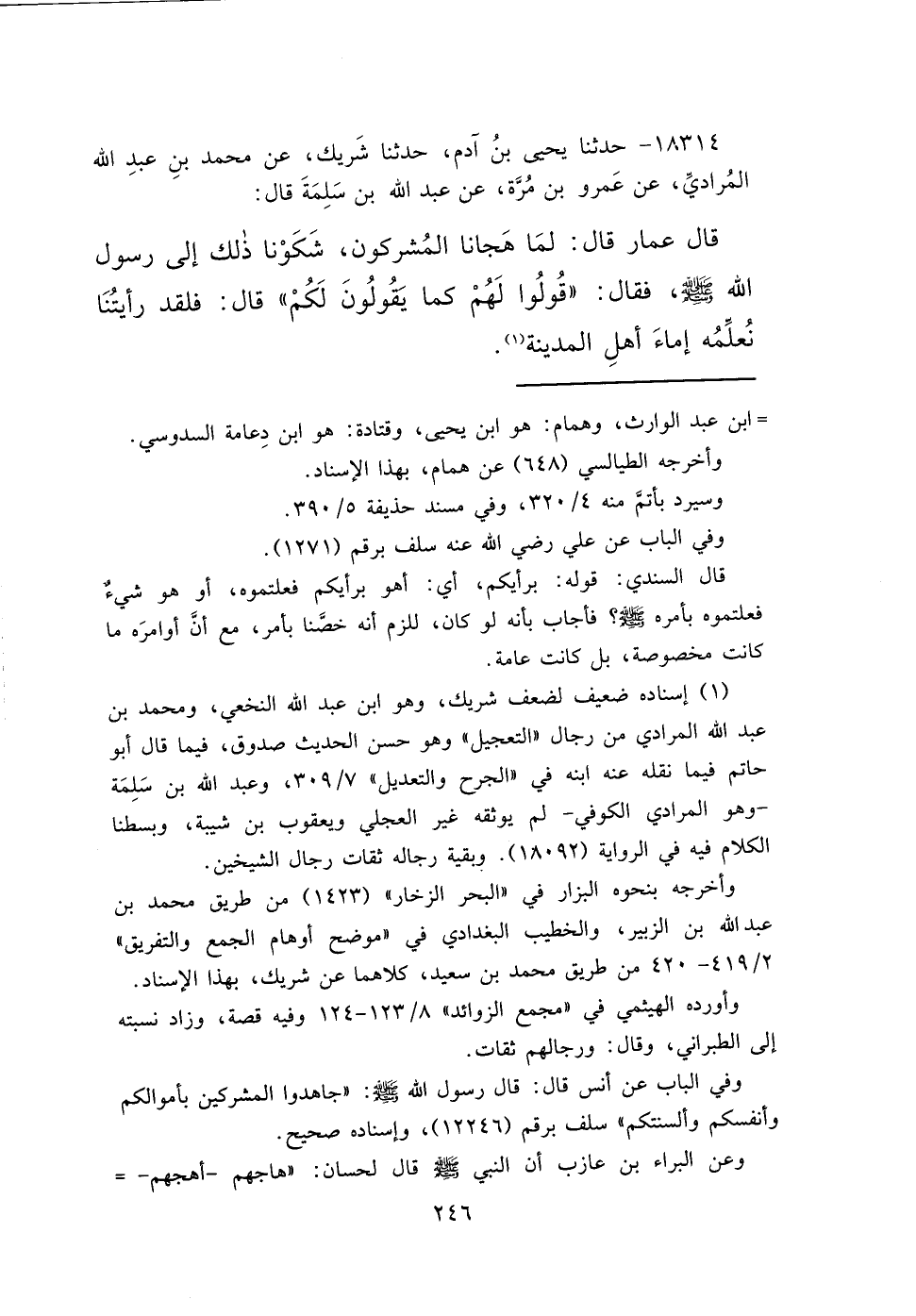 ١٨٣١٤ - حَدَّثَنَا يَحْيَى بْنُ آدَمَ، حَدَّثَنَا شَرِيكٌ، عَنْ مُحَمَّدِ بْنِ عَبْدِ اللهِ الْمُرَادِيِّ، عَنْ عَمْرِو بْنِ مُرَّةَ، عَنْ عَبْدِ اللهِ بْنِ سَلَمَةَ، قَالَ: قَالَ عَمَّارٌ قَالَ: لَمَّا هَجَانَا الْمُشْرِكُونَ، شَكَوْنَا ذَلِكَ إِلَى رَسُولِ اللهِ صَلَّى اللهُ عَلَيْهِ وَسَلَّمَ، فَقَالَ: " قُولُوا لَهُمْ كَمَا يَقُولُونَ لَكُمْ " قَالَ: فَلَقَدْ رَأَيْتُنَا نُعَلِّمُهُ إِمَاءَ أَهْلِ الْمَدِينَةِ (١)